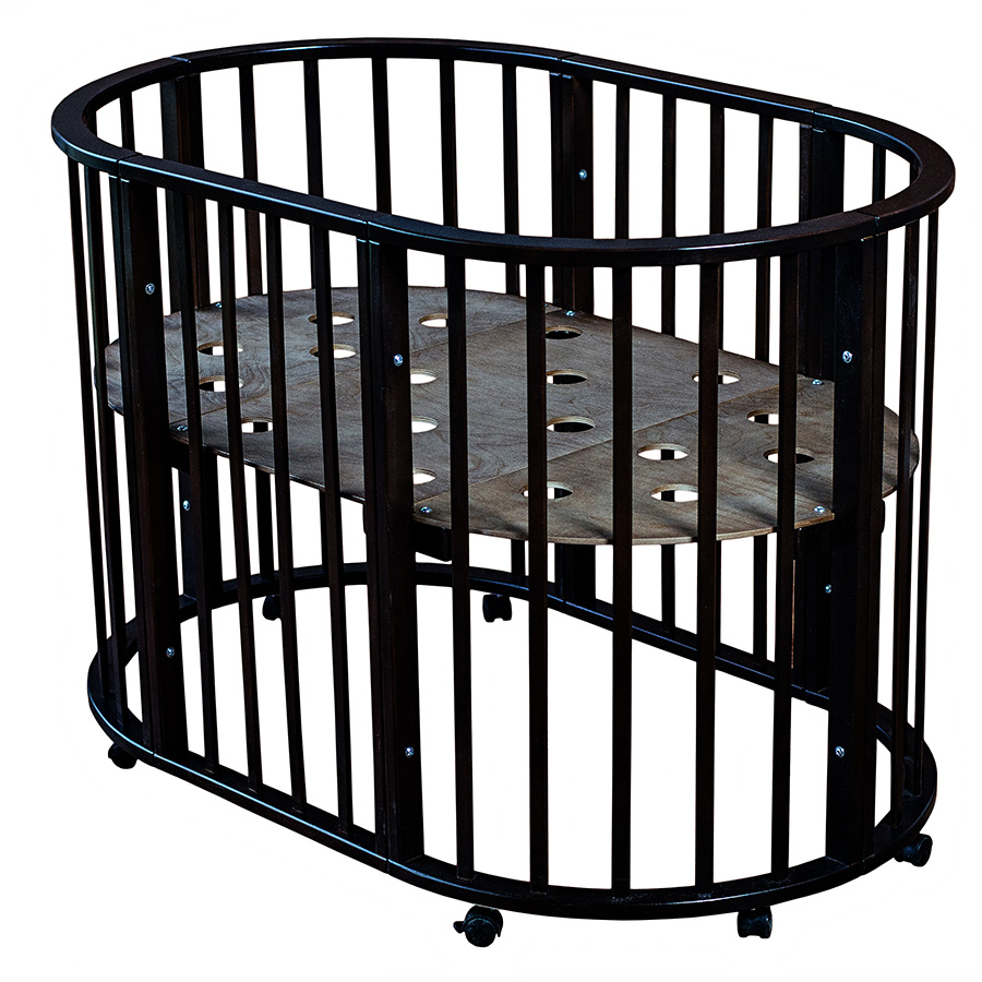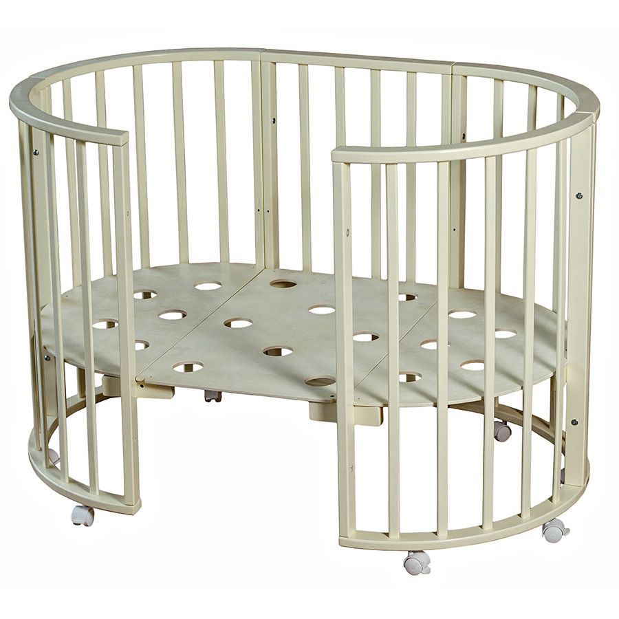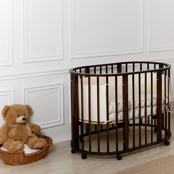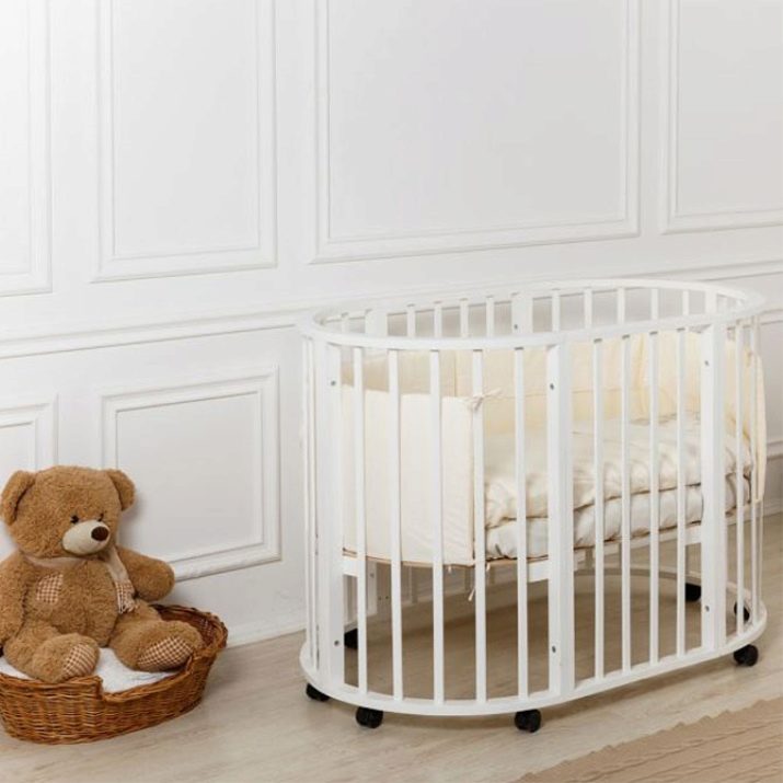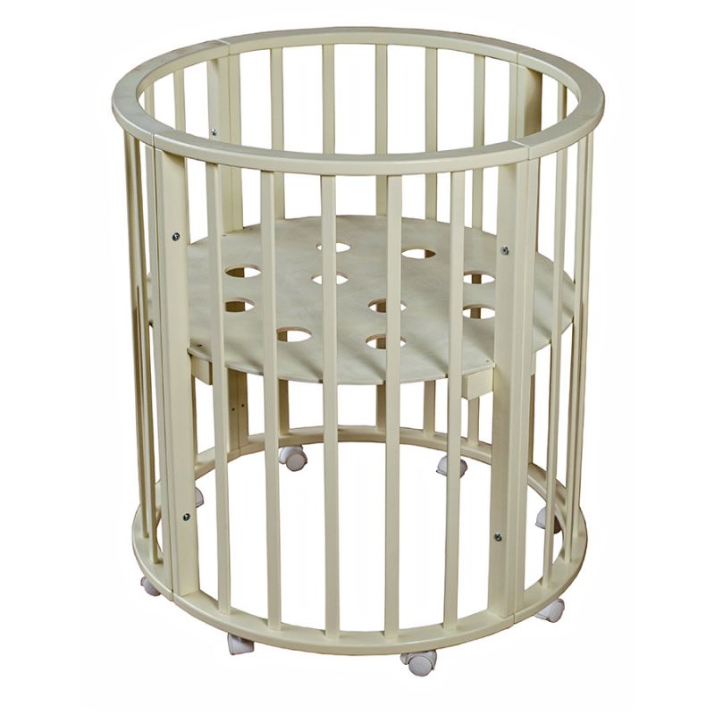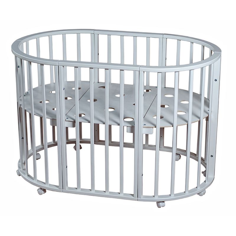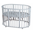 The Nicole model is a transforming bed for newborns from the My Kid trademark. It combines comfort, practicality and great design.As the baby grows, Nicole's bed can be changed in shape, for example, to make an oval from a round one. This model is completely devoid of dangerous sharp corners, so it is absolutely safe for the baby. For optimum ventilation, manufacturers have made the bottom of the crib perforated.