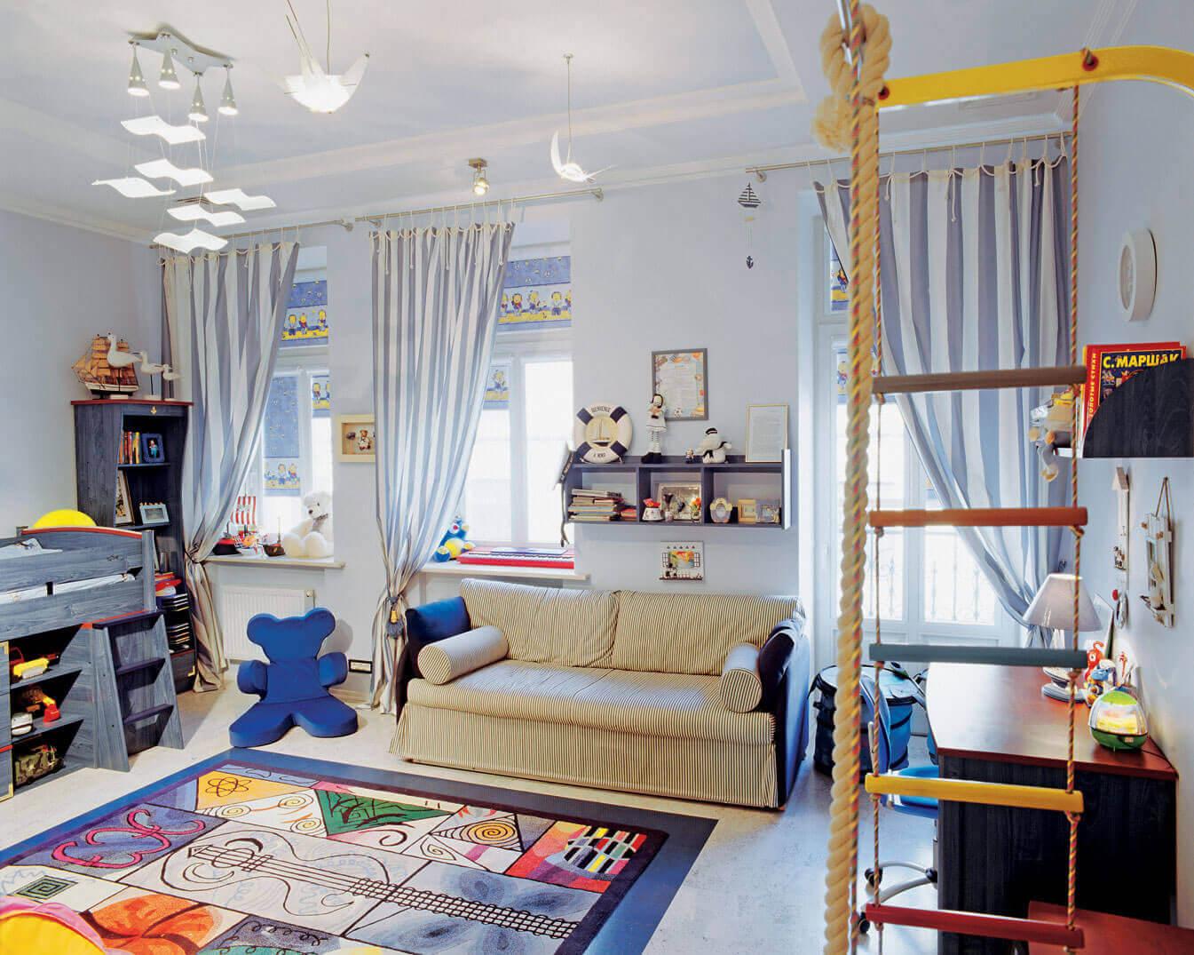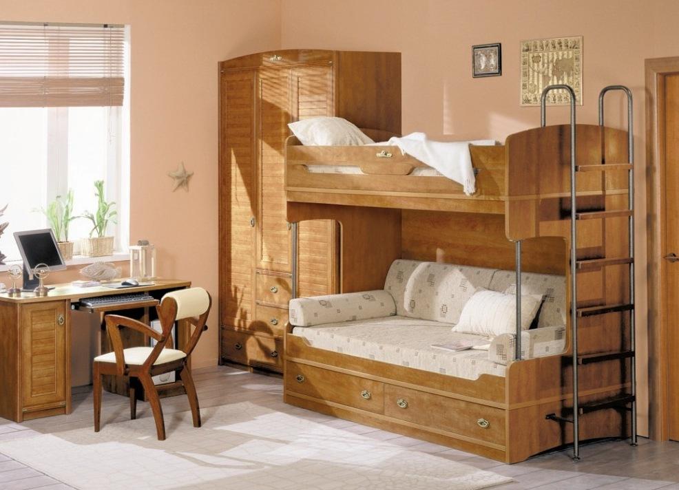The sofa in the form of a transformer helps to save space in your child’s room. For example, you can choose eurobook or accordion.