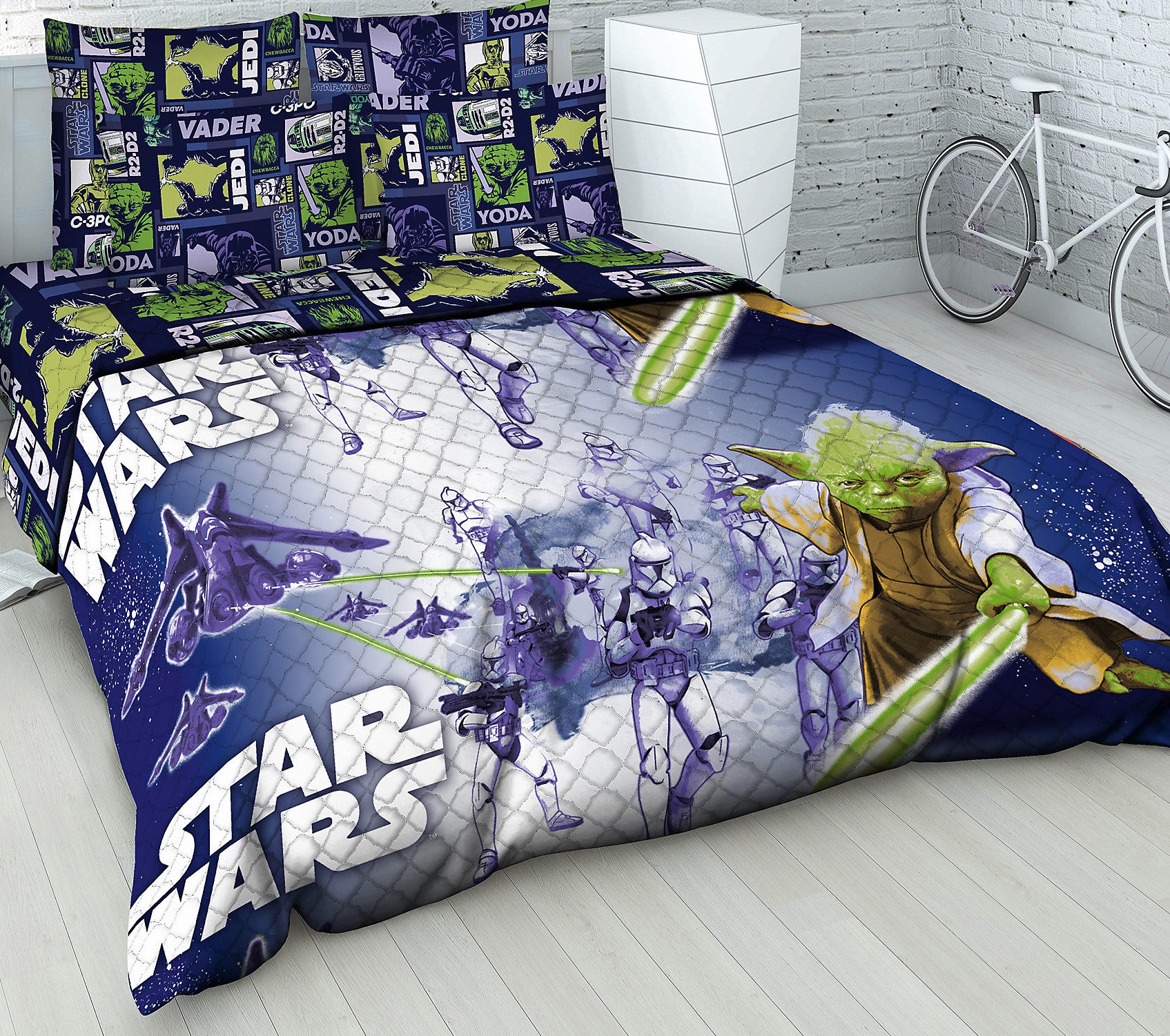 Mostly bedding sold in the installed configuration: duvet cover, sheet, pillow. Double and one-and-a-half sets are completed with two headboards.