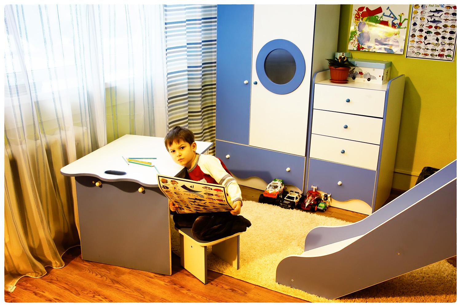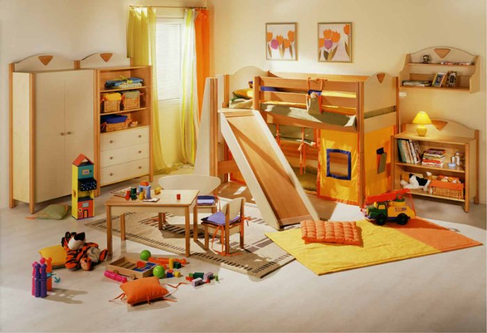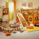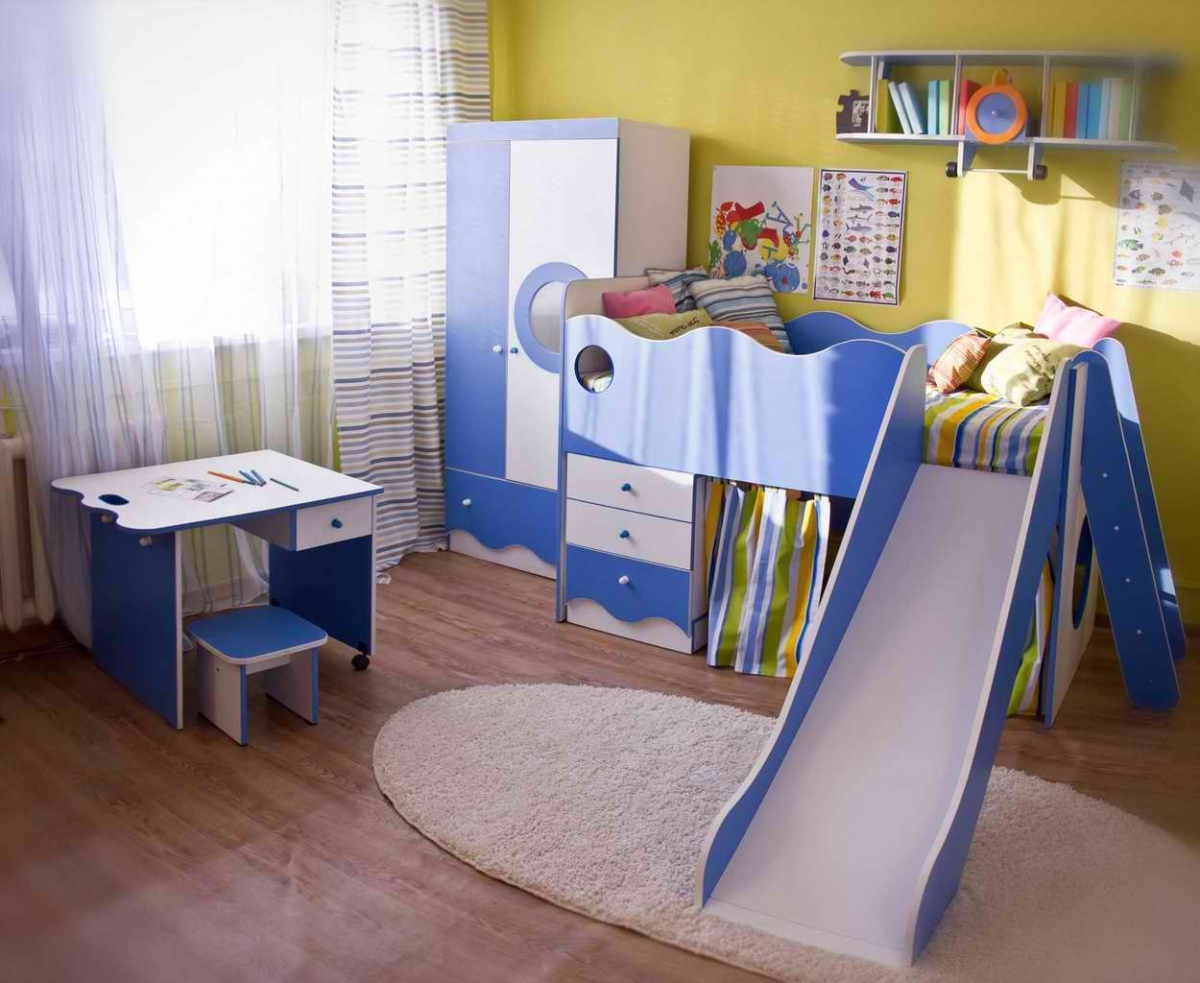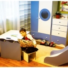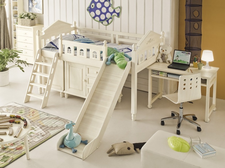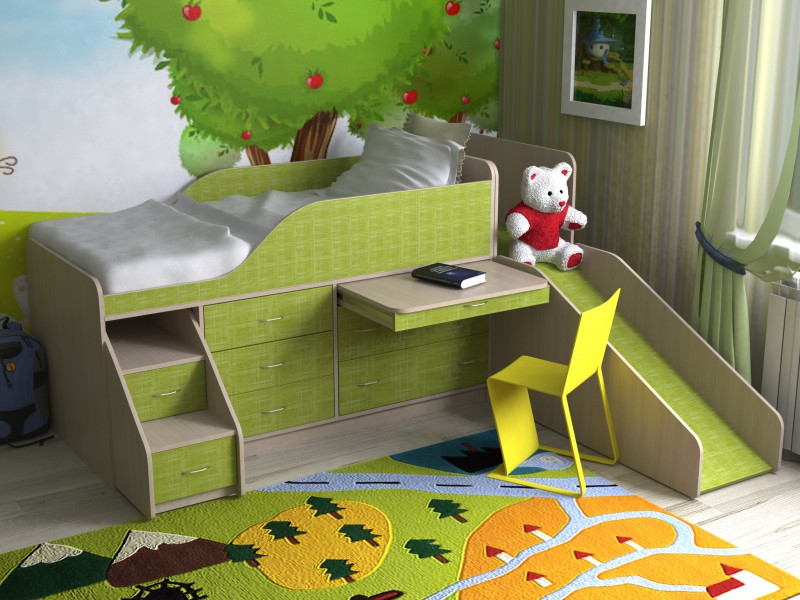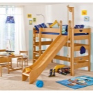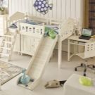 Some beds lofts with a slide provide for a working area, which is usually located under the bed. This is a very convenient and economical option that not only accommodates a few furniture items, but also leaves enough space for other items in the room.Such bedroom sets are ideal for rooms with a small area. In this case, be sure to hold the lighting under the table, so that the child has enough light during class.