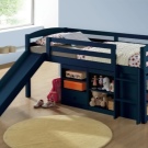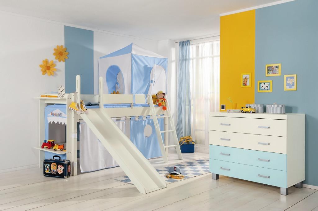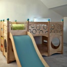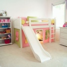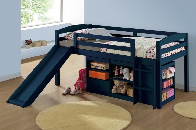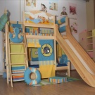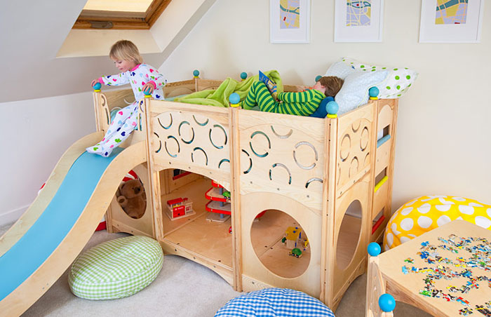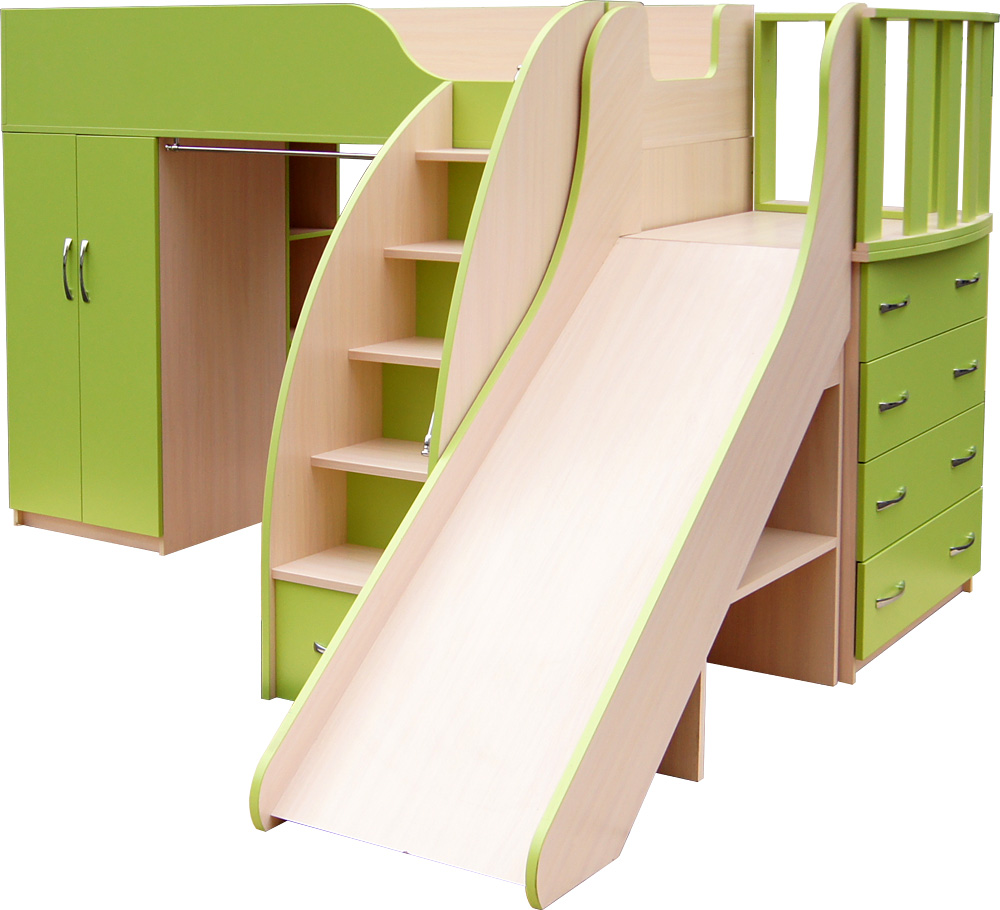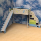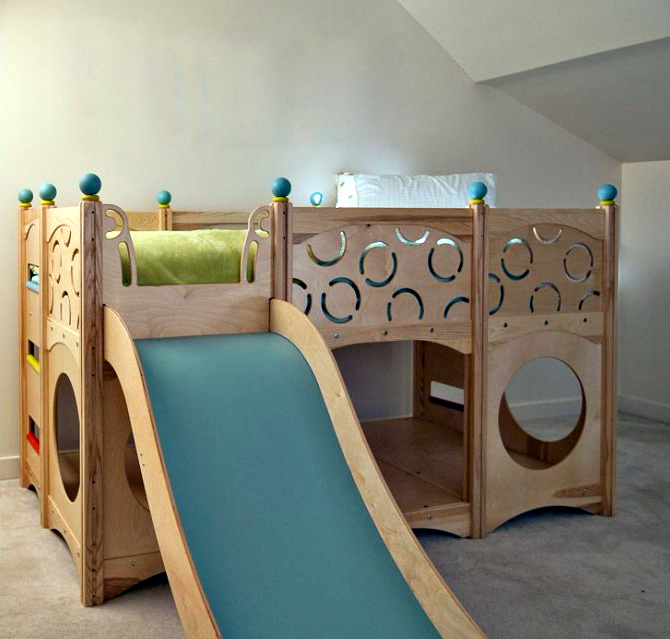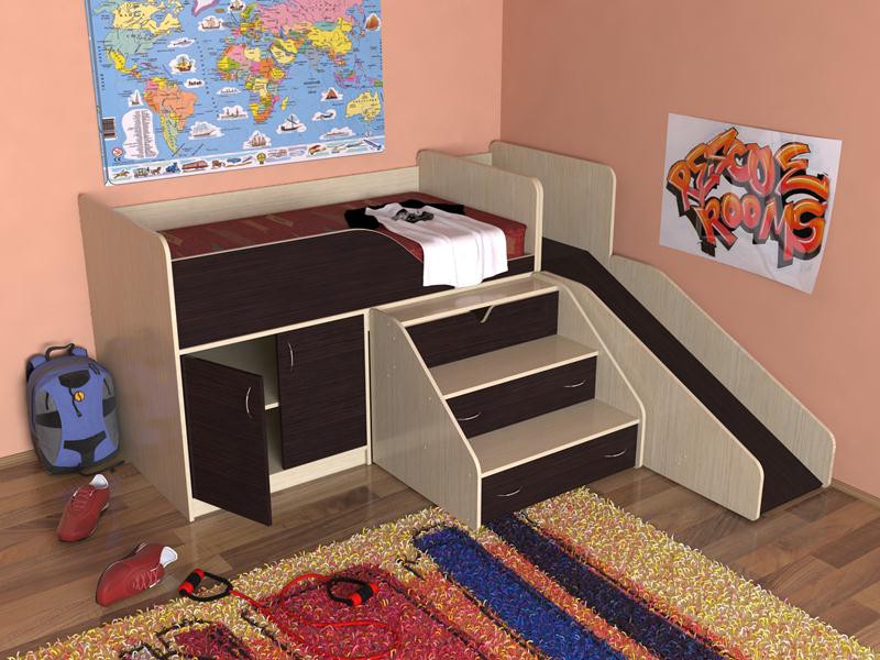 A children's bed with a slide is an excellent example of furniture that combines a sleeping place and a play area. For this purpose, you can use any bed, the height of which reaches at least one meter. There are special beds lofts where the space under the bed is used as storage of some things. Some organize a playroom for small children there,but in this case one should be very careful, as there is a small risk that the child may hit his head due to carelessness.