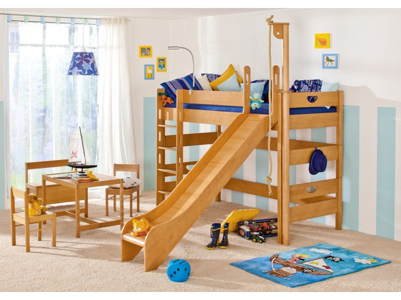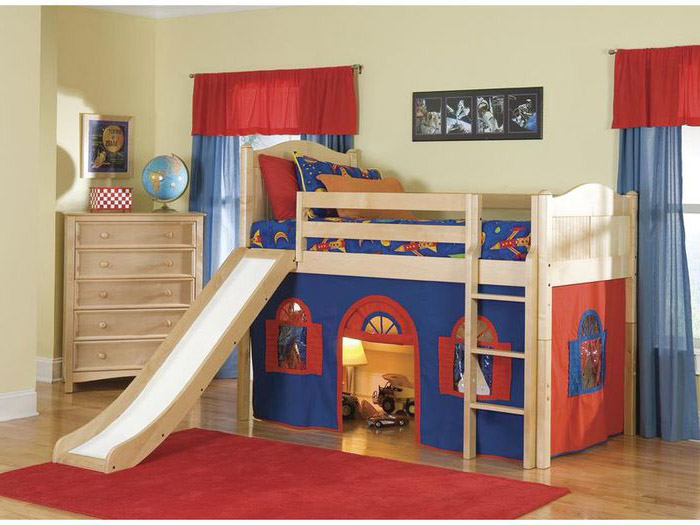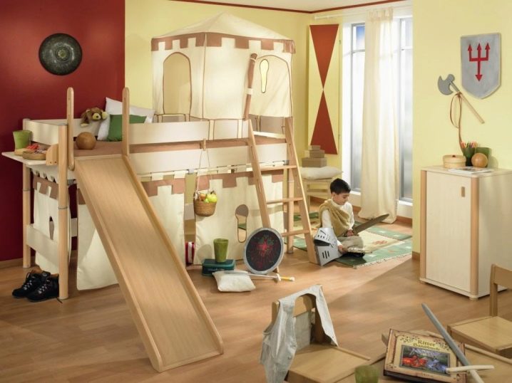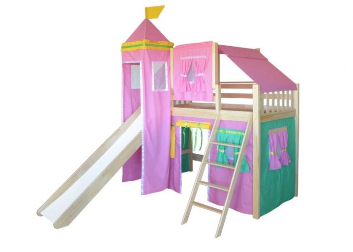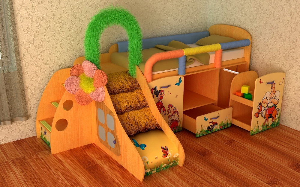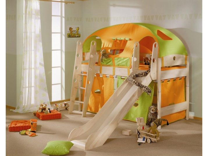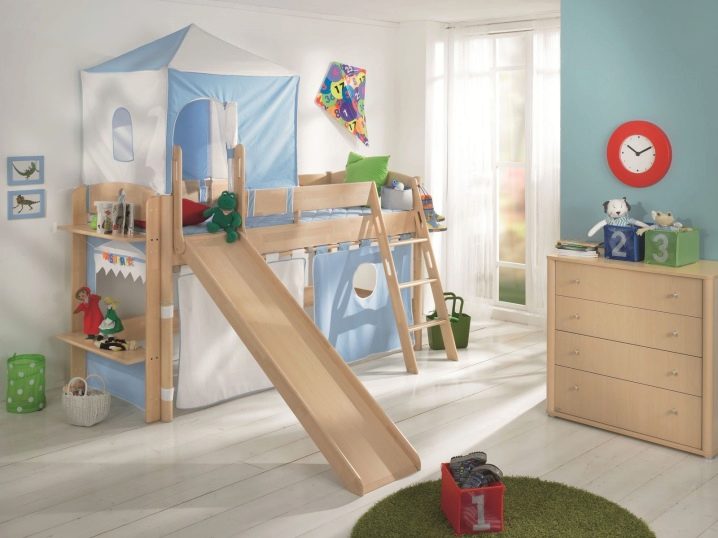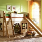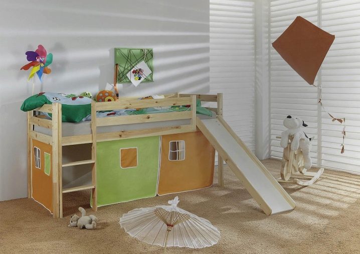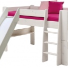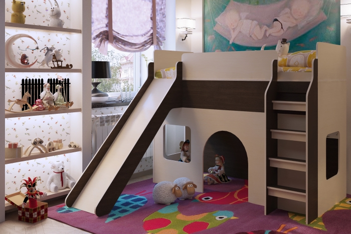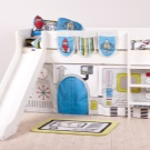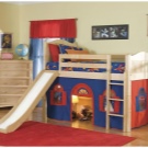 The most common model with a slide is loft bedwhich is an analogue of a bunk bed, but with only one berth at the top and a ladder.The height of this design varies from one meter to the possibility of a normal descent from the slide. This model is practical, beautiful and very original. The space under the bed itself can be used in completely different ways.