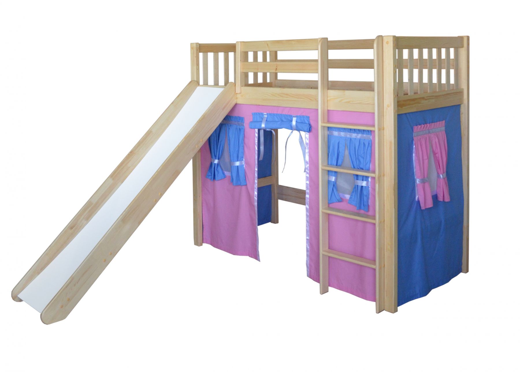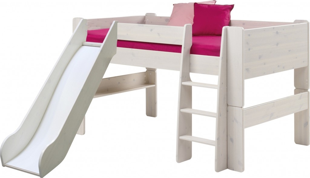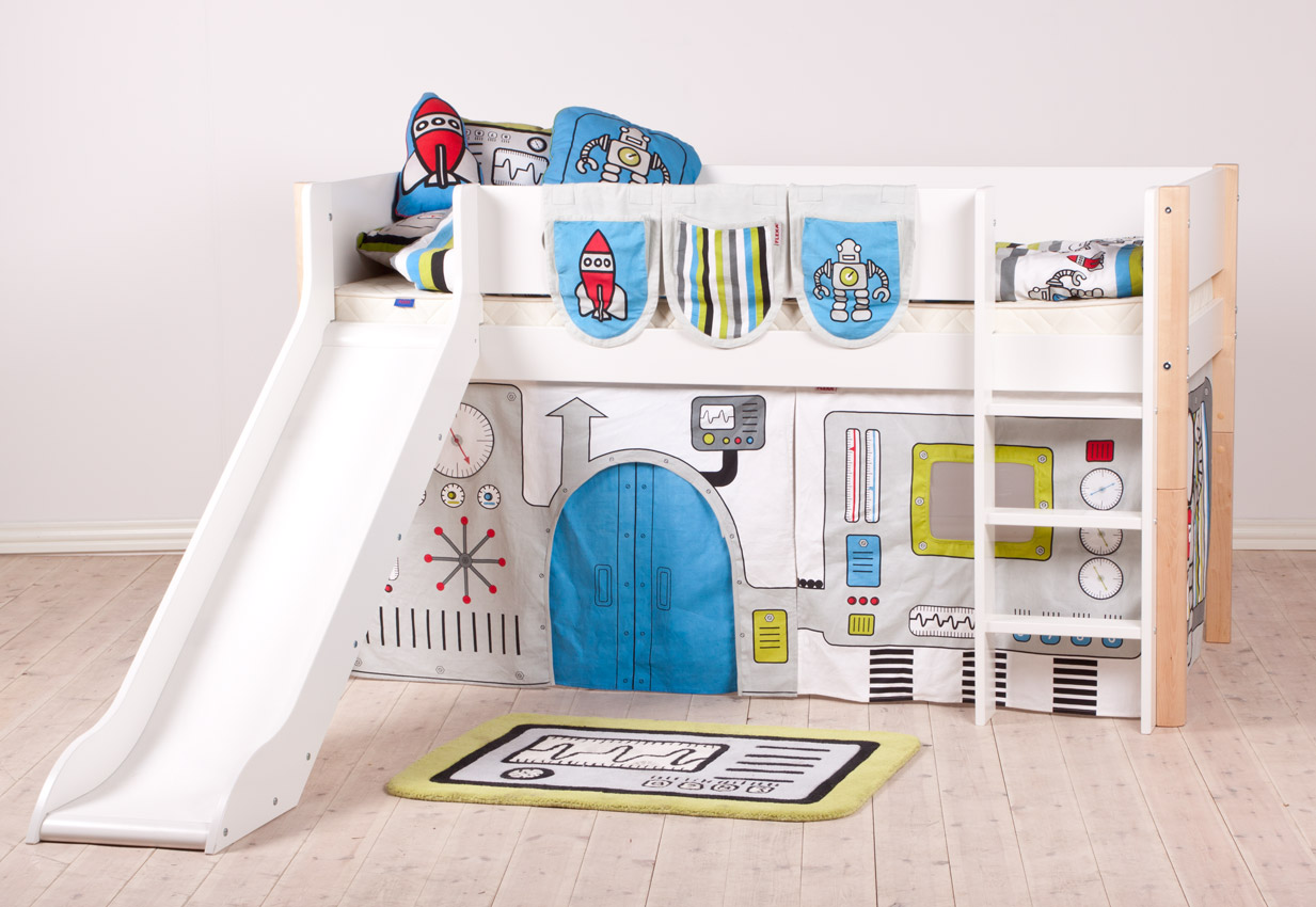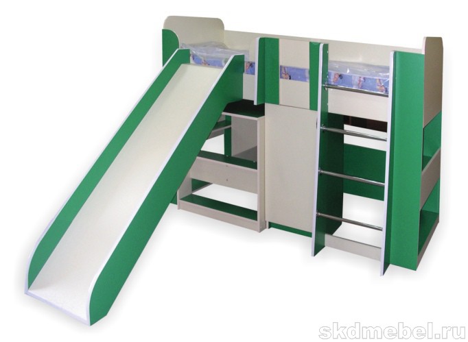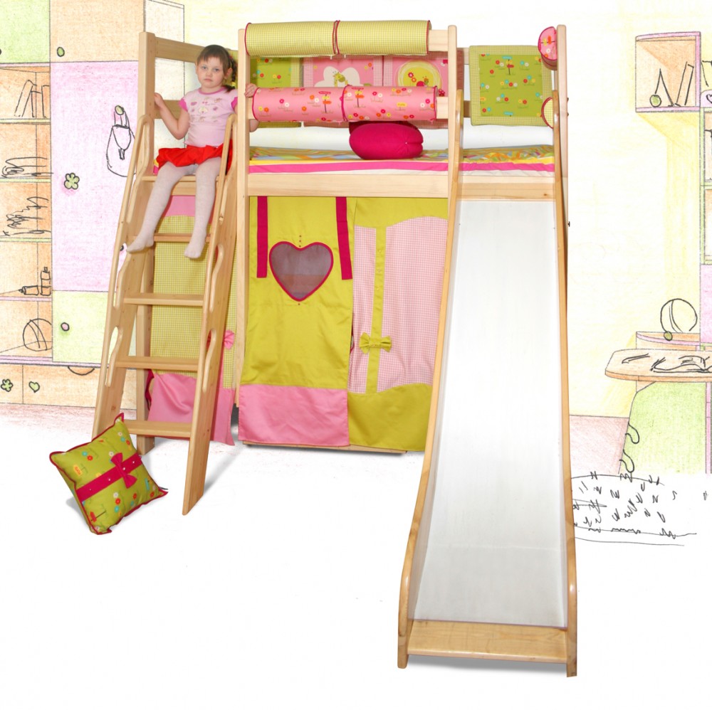 The most common model with a slide is loft bedwhich is an analogue of a bunk bed, but with only one berth at the top and a ladder.The height of this design varies from one meter to the possibility of a normal descent from the slide. This model is practical, beautiful and very original. The space under the bed itself can be used in completely different ways.