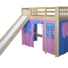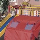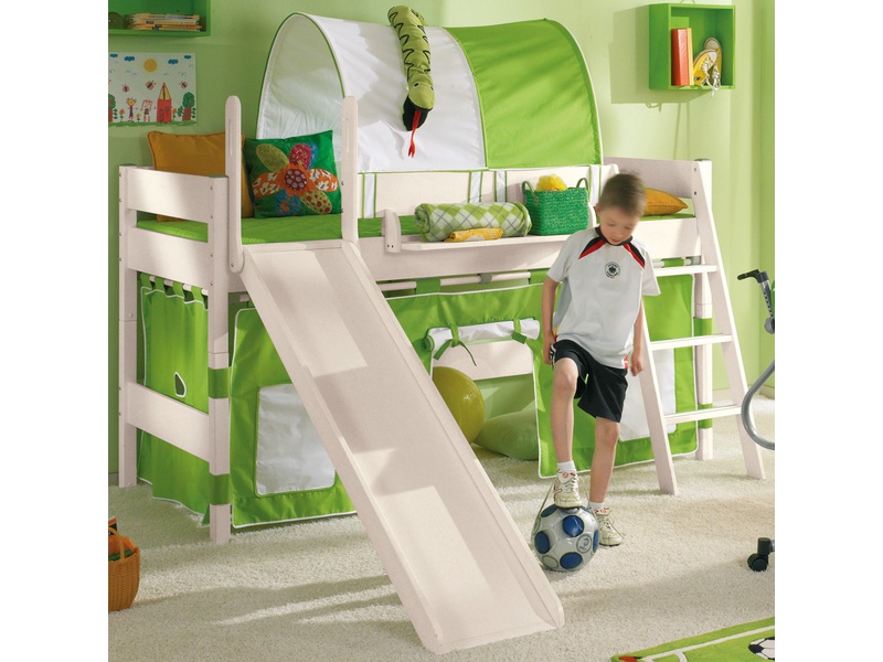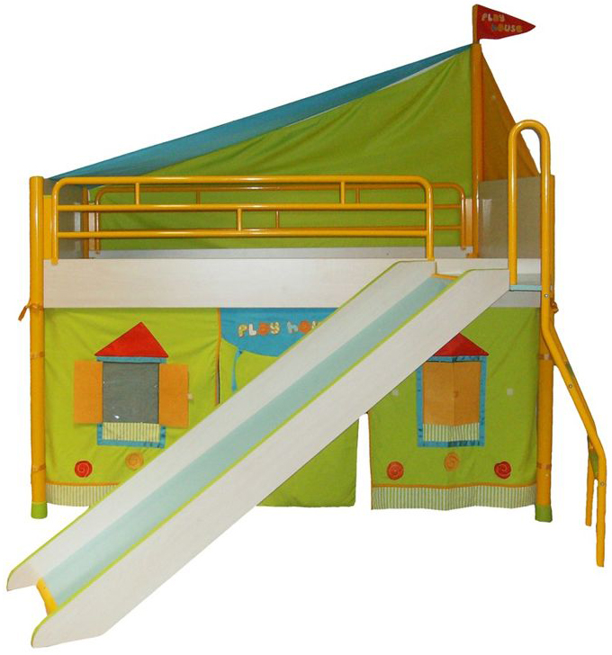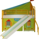 Beds with a slide from Cilek from the playful coco series have a bright design, dominated by blue, red, yellow and green colors. Unlike other brands, these beds are made of metal, and the slide and ladder are attached to the side of the bed as if in a separate unit. The lower tier is curtain in the form of a tent and has its windows and a door. This is a ready-made gaming house, which does not need any additions.