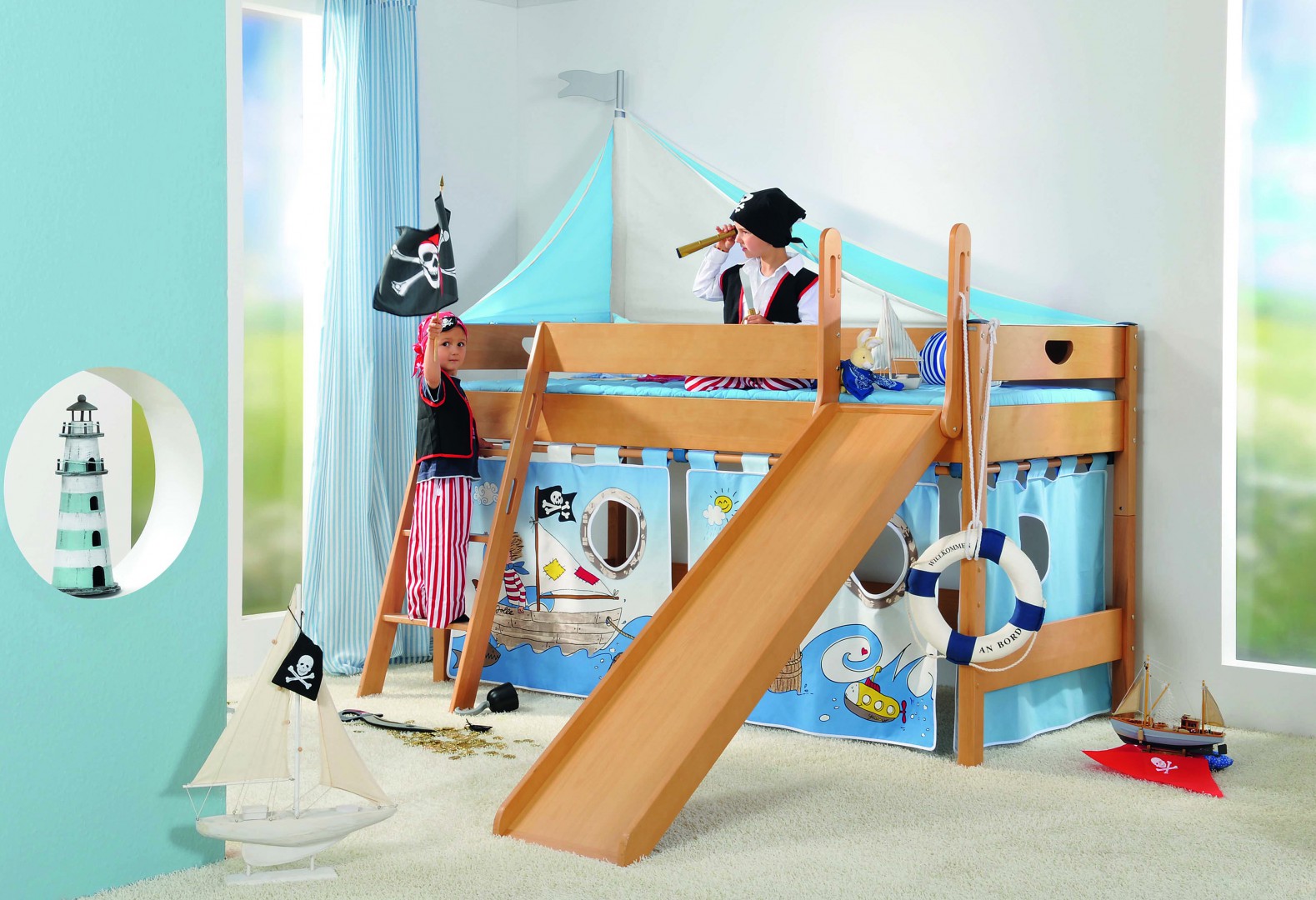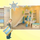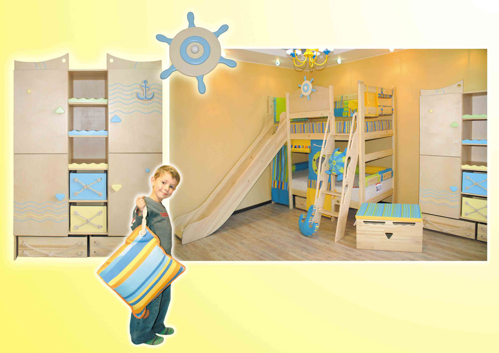 If the child is keen on marine-themed, then you can buy a bed with a slide in white and blue colors, supplement it with a sail and a mast, as well as a steering wheel. The lower part can become the captain's office, where the map will hang.