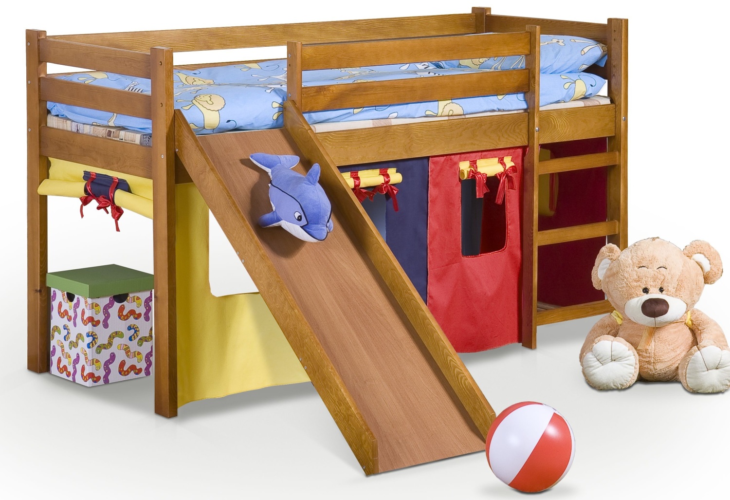 Beds with a hill from this brand are also made of natural materials and have a hill with a convenient ladder and a wide side. Under the bed there are additional cabinets, open or closed - the customer decides for the storage of children's clothes, toys and clothes. This is very convenient, as parents will not have to worry about purchasing additional shelves for the first tier.