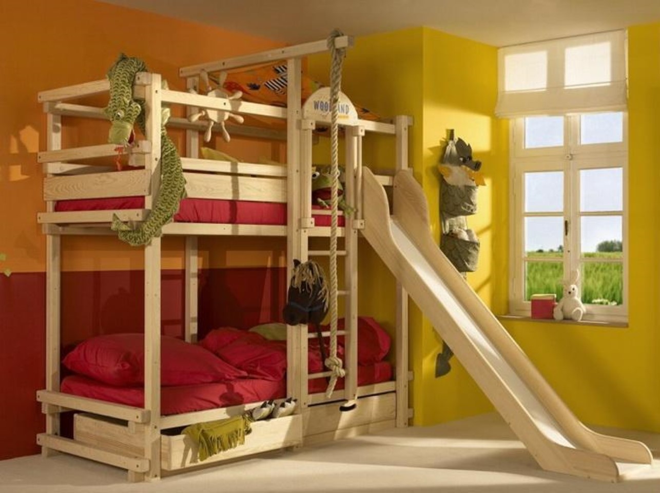 In case you are happy parents of two children, you can safely buy a two-tier model with a slide for children. They will be delighted. Of course, the slide does not replace the stairs, it is only an assistant during the descent, and in order to climb, the child will have to use the stairs installed nearby. Bunk beds with a slide are very comfortable, as they take up much less space than two separate beds, and the slide will bring a lot of positive emotions to children.