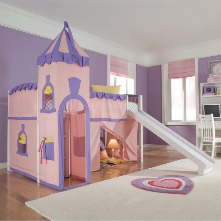 When choosing a particular model, you need to look at the appearance, so that it would be to the liking of the child. For girls it is better to choose beds of soft, pink or white tones. You can buy real castles of princesses, the descent of which will be carried out from a hill. Your girl will feel like a heroine of Disney cartoons.