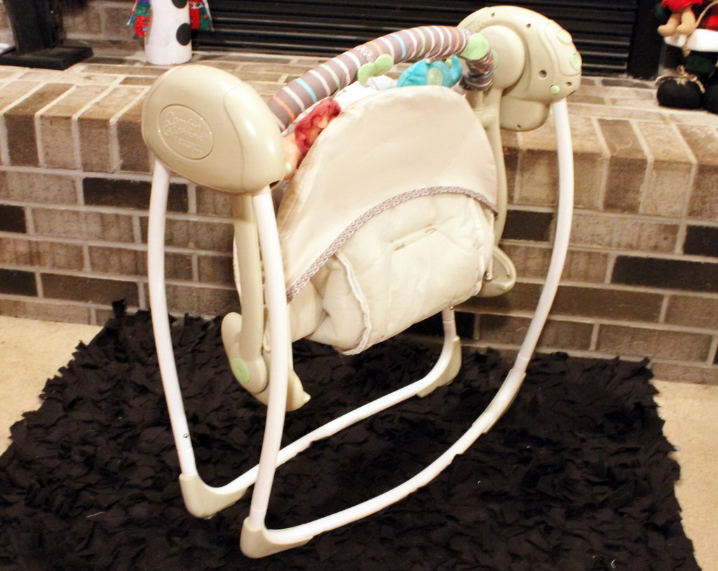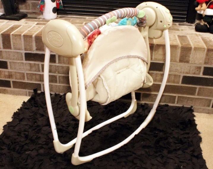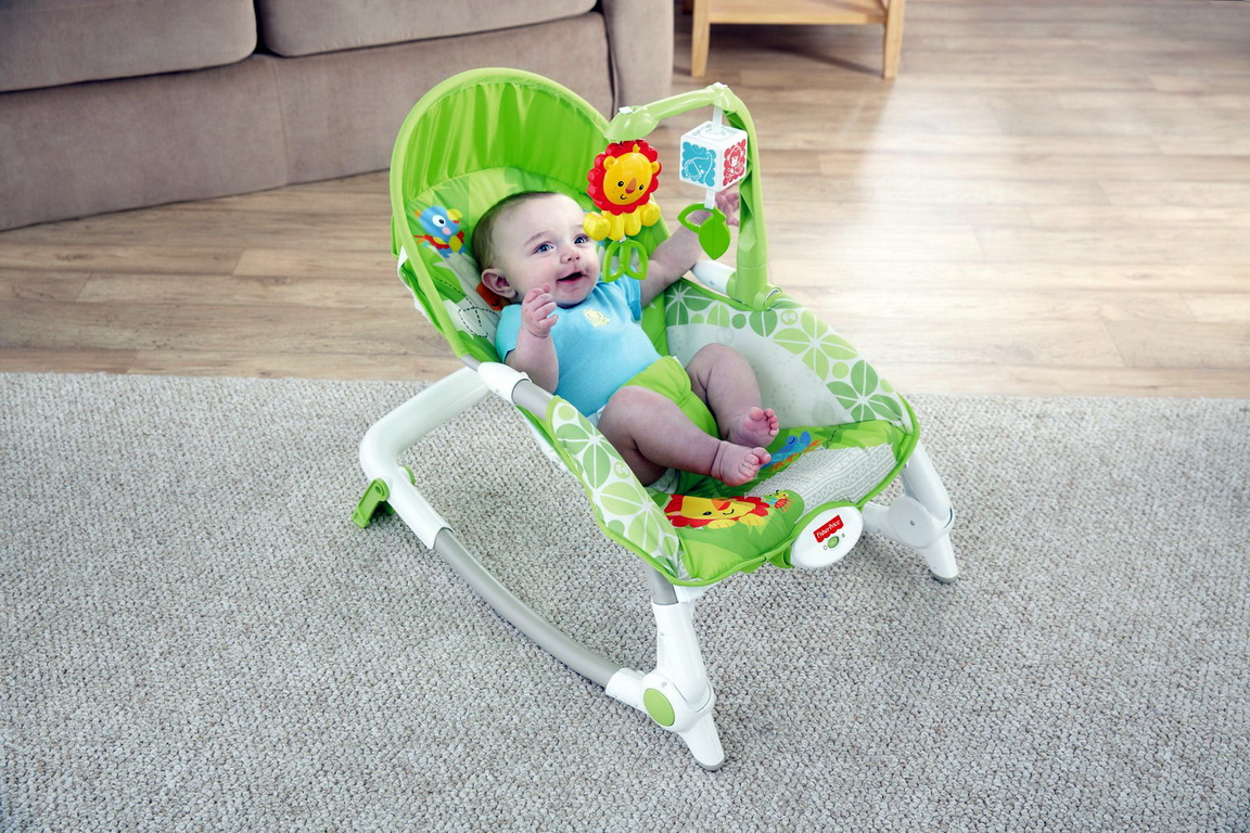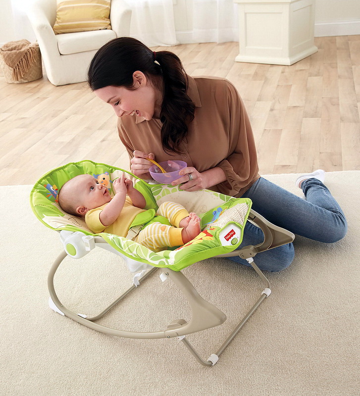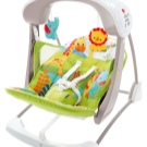 - Fisher-Price Deluxe Take Along Swing and Seat - rocker. It is classically decorated with arches and seat mats with a good shock-absorbing system. Have a six-speed mode and a set of nice melodies. Equipped with toys. Lightweight and well mounted, that is appreciated when traveling and moving.