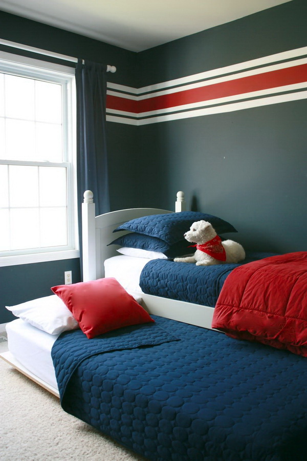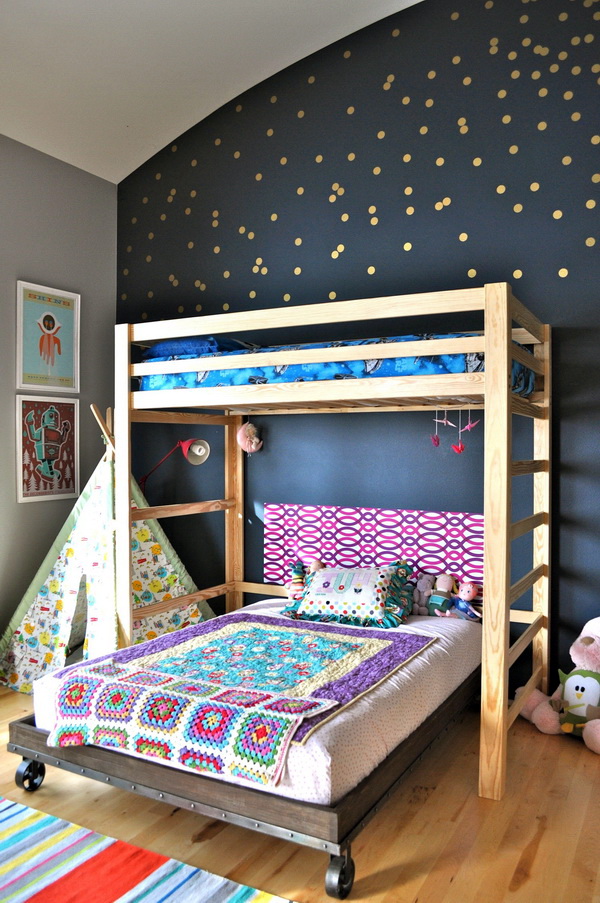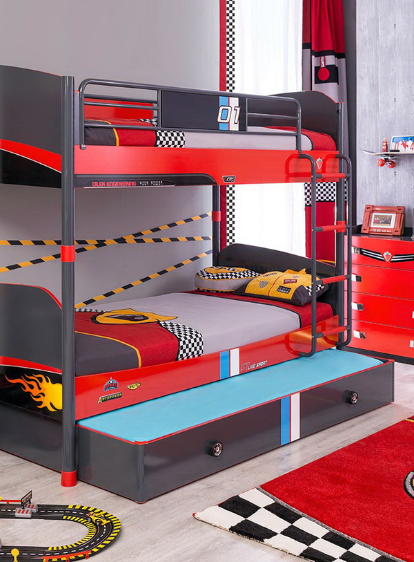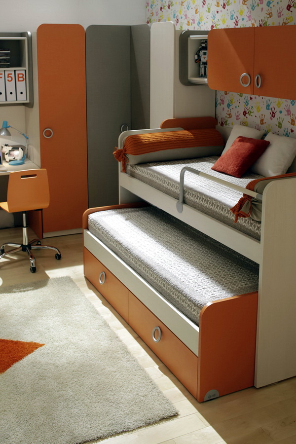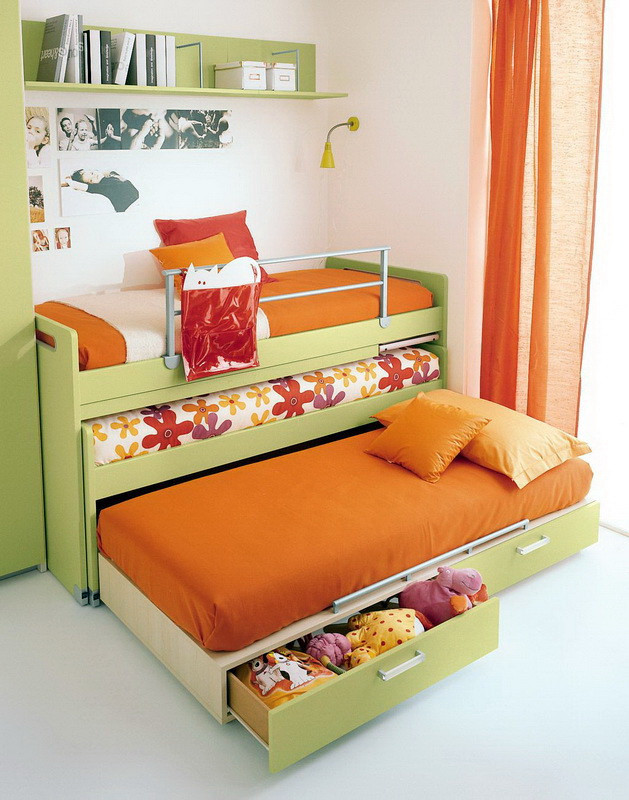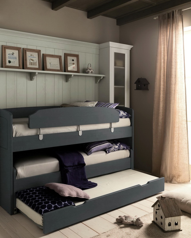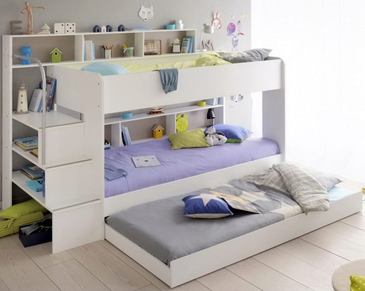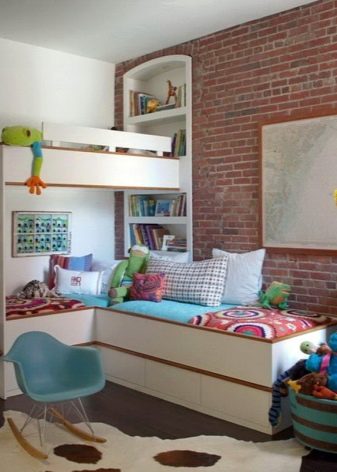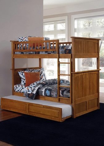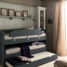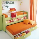 Another type of children's bunk bed - roll out. The upper part of the bed is a high sofa, and the lower is a retractable sleeping platform. It turns out that they have two places located at different height levels and in appearance when folded they resemble an ordinary bed. Plus - compactness, as well as the absence of stairs and racks. Minus - a small number of additional devices. It will look good in small children's rooms.