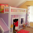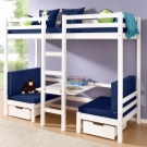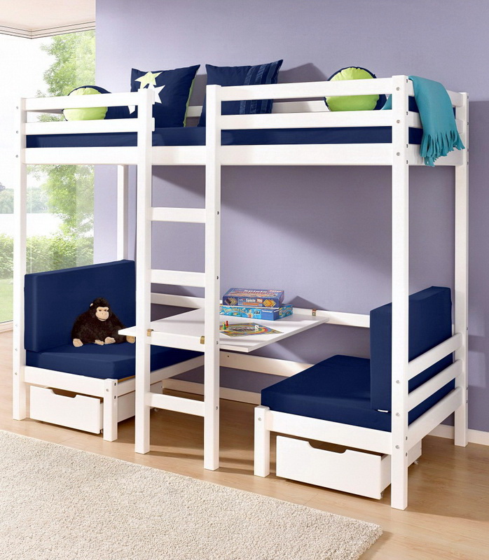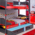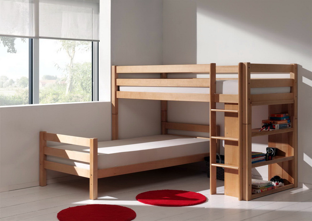 A bunk corner bed is a single bed, standing on racks, on top of another perpendicular (they have a g-shaped top view). Beds always contain additional features.The biggest advantage in such beds, for example, is a sports complex, which will make the life of children most exciting and fun in the sports and gaming field. This kind of bunk beds is not the most economical and practical in a small room of a nursery and requires a lot of space.