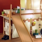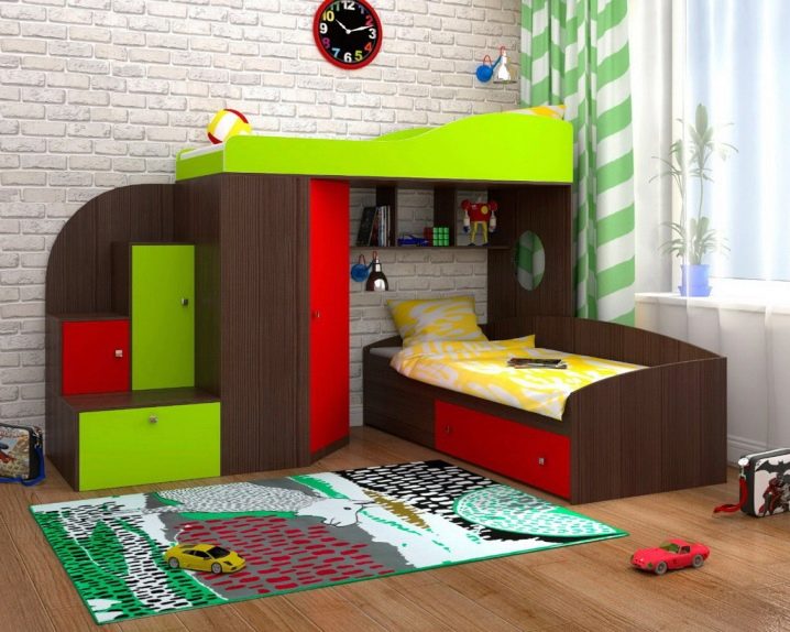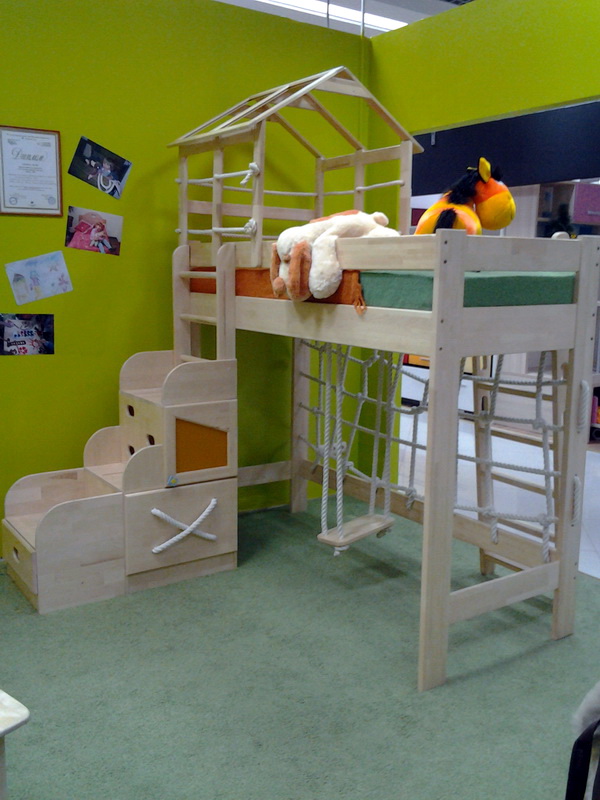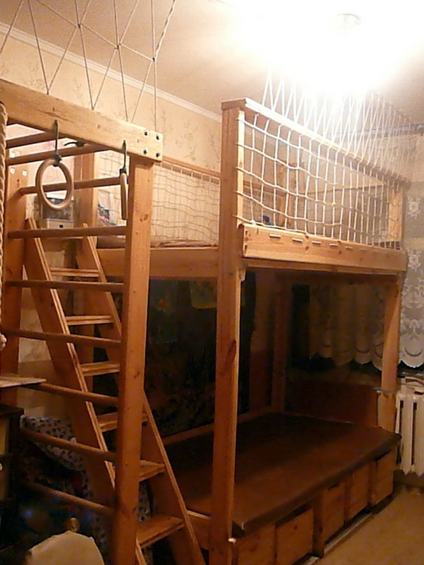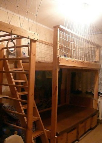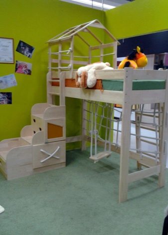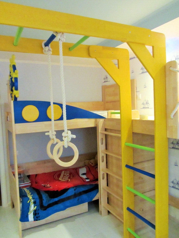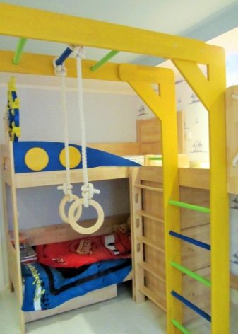 As already mentioned,along with bunk beds, there may be sports equipment: a swedish wall, a rope, gymnastic rings, a crossbar, a rope ladder, and sometimes slides, etc. This may be part of the bed or in addition to it. In any case, these beds will delight children who love sports. Sports complexes are mainly installed on the "loft beds".