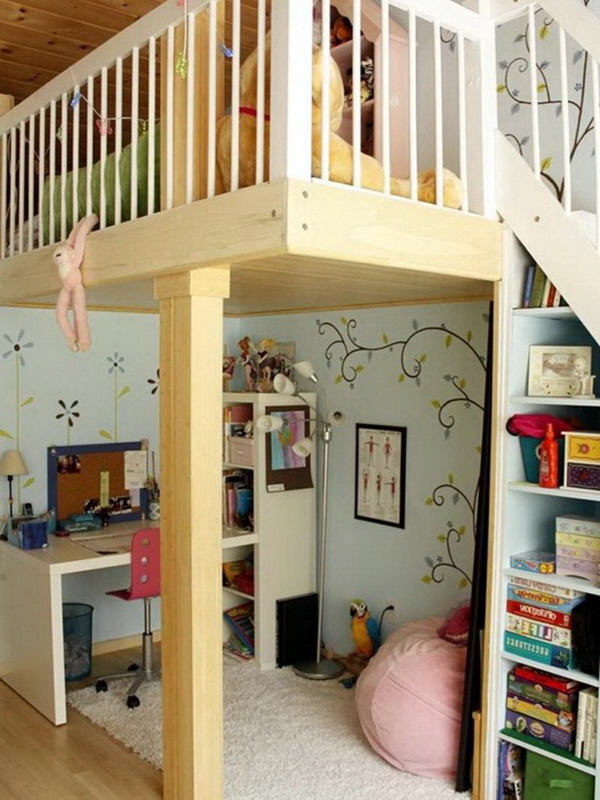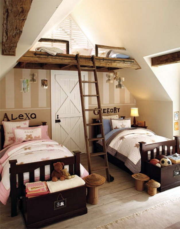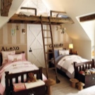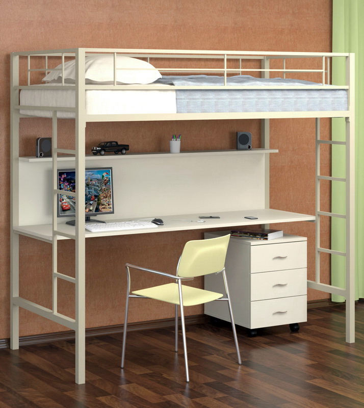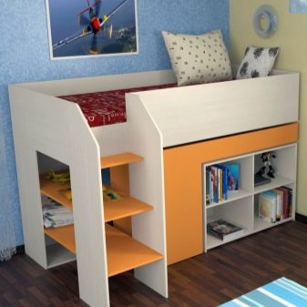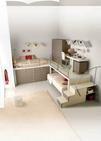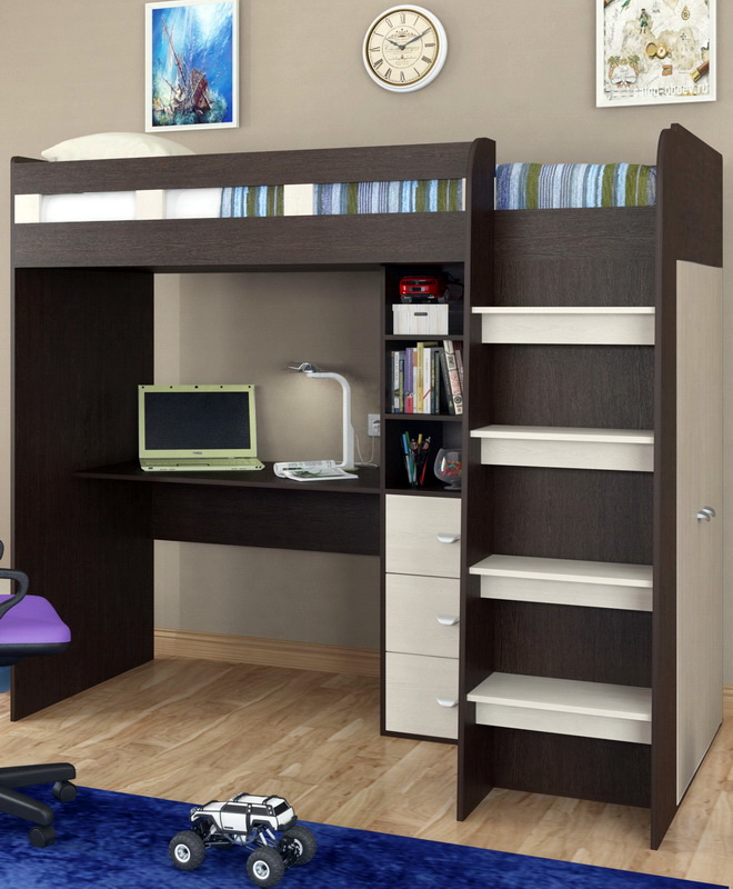 There is also such a type of bunk bed as "attic", which is designed mainly for one child. He is a bed on high racks, raised above the workplace - a desk.Plus - multifunctional design. Minus - the requirement of a large space, high ceilings. It has stairs, sides, and also built-in lockers. There are the same types of bunk beds with only two beds on the 2nd floor, which can provide a bed for two children at once.