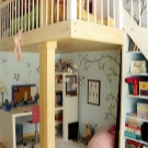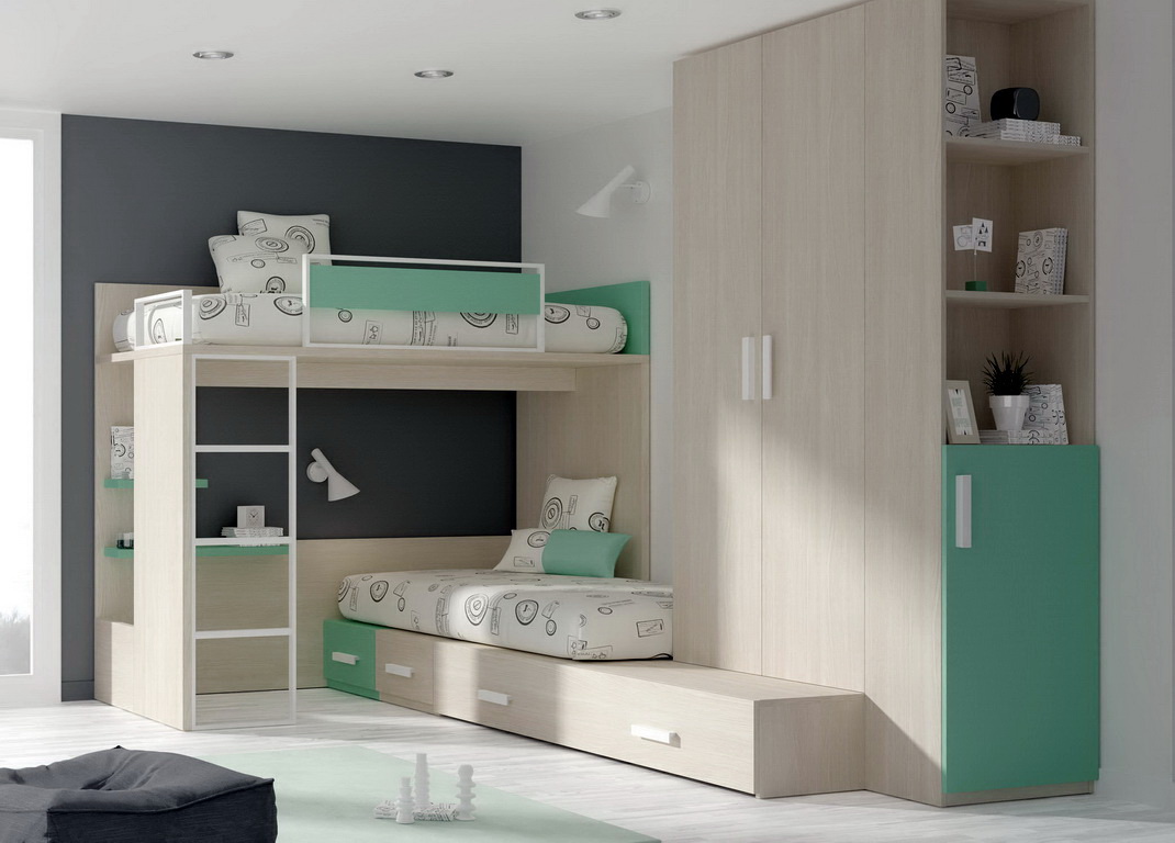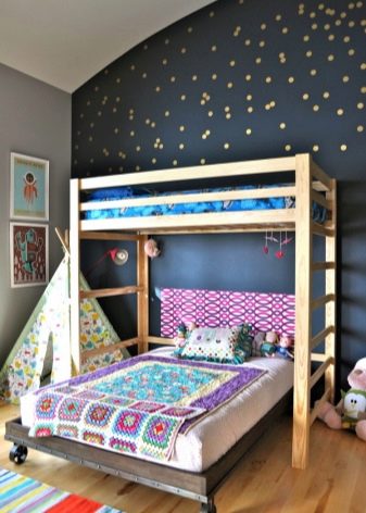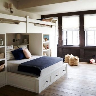 Another equally interesting view of double-decker beds is a “bed-wall”. Such beds are a sleeping place with a furniture element attached to it - a wall consisting of shelves, cabinets, chest of drawers and, possibly, desks, and adapted to the children's room. The plus of such furniture is that it is made in the same style. A minus can be its rather large dimensions, because of which the bed-wall will simply be difficult to combine in the room with other pieces of furniture.But the wall may well replace a wardrobe or a desk, and also contain some elements of sports equipment.