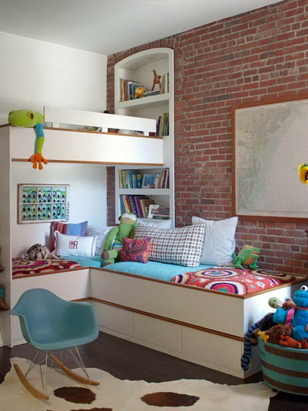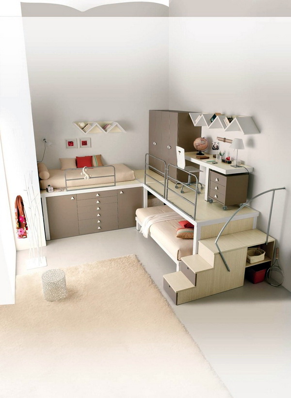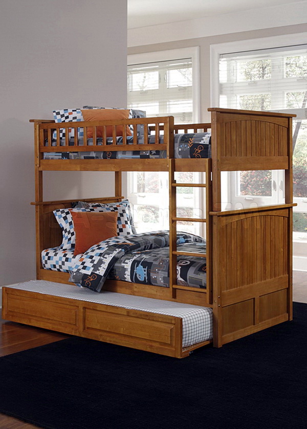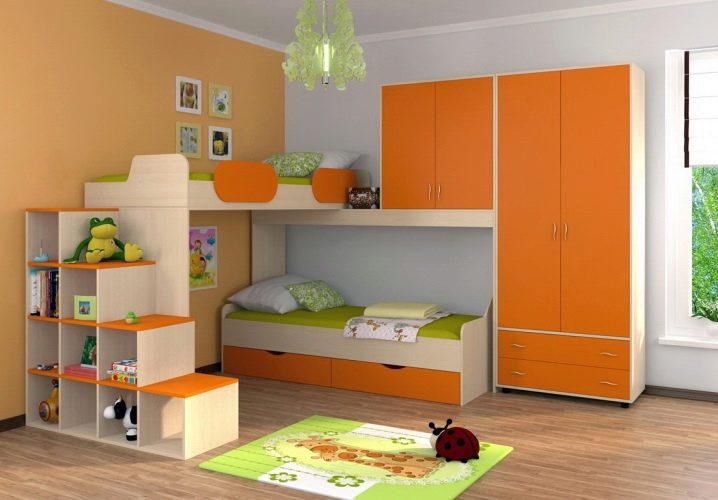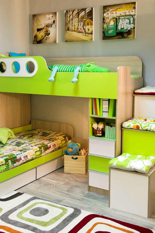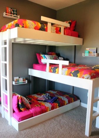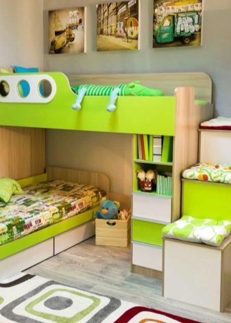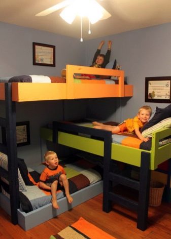 Such beds can have not only two, but also several beds. In addition, this type of bunk beds in some cases has a workplace, niches for storing clothes, and possible sports mini-complexes (rope, wall bars, rings), but they exist without any additions. A wardrobe or desk can be located under the top of the bed. These beds are the best choice for large families who in every way need to keep their house clean and tidy, as well as make it quite comfortable. Also such beds can get and small families with two small children.