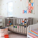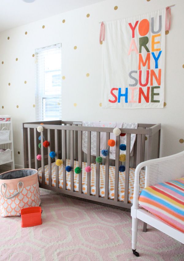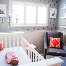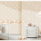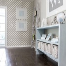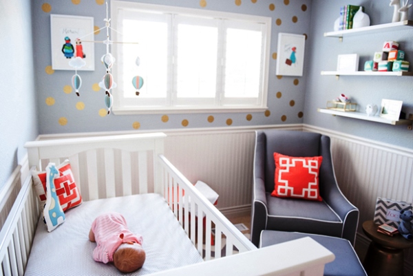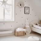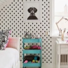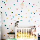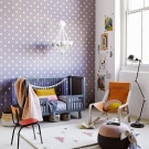 Although polka-dot wallpaper is considered to be a win-win option for a nursery, it’s not worth fully filling the space with it. It is preferable to glue them with fragments, combining with other drawings. It can be thin lines, small color elements, geometric signs.