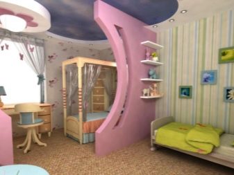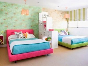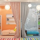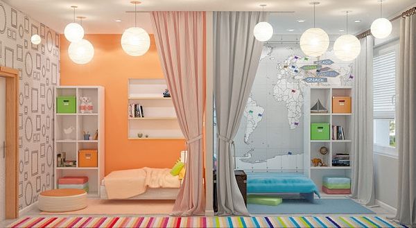 If you are planning to repair in the nursery, it is very important to take into account the interests of each child. For this you need to zone the space.The room can be divided both diagonally and perpendicular to the wall. In this case, you need to choose wallpaper companions or choose the color solution yourself, while ensuring that the design of the room as a whole is organic. To divide the space between parts of the room can be different curtains, partitions or shelves, but the decor of the walls should be in the same stylistic decision. If this wallpaper, they should be present in both parts of the room. If there is a bright accent in one part of the room, then it should be in the other too. Otherwise, the design of the room will not develop into a single picture. Other details of the interior will also help to arrange the separate parts of the space for the boy and for the girl: lighting fixtures, baseboards, floor covering, textiles.