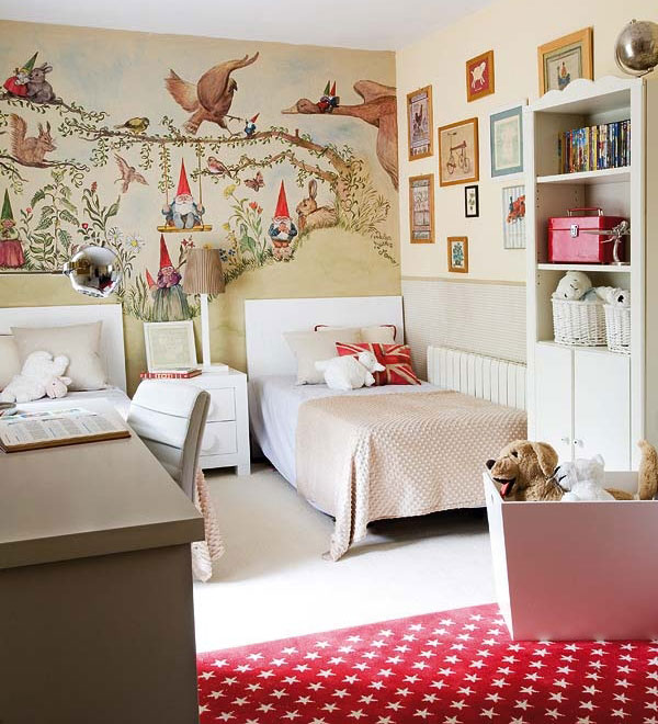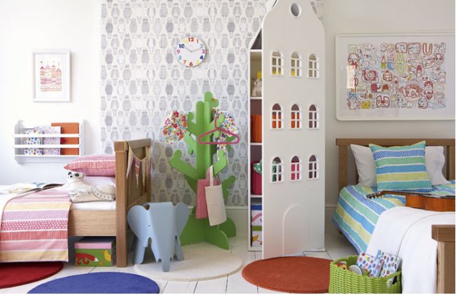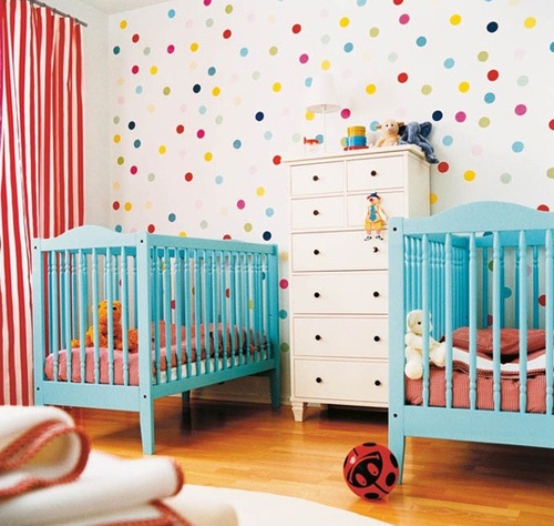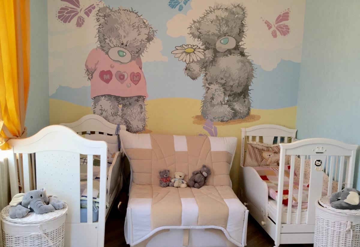 In the nursery, where the preschoolers will live, it is worthwhile to single out one wall to unite interests. For example, paste wallpapers with cartoon characters that both children love (Paw Patrol, Polly Robokar). Or buy wallpaper coloring. This type of wallpaper will not only be able to interest children, but also combine them with a common occupation.