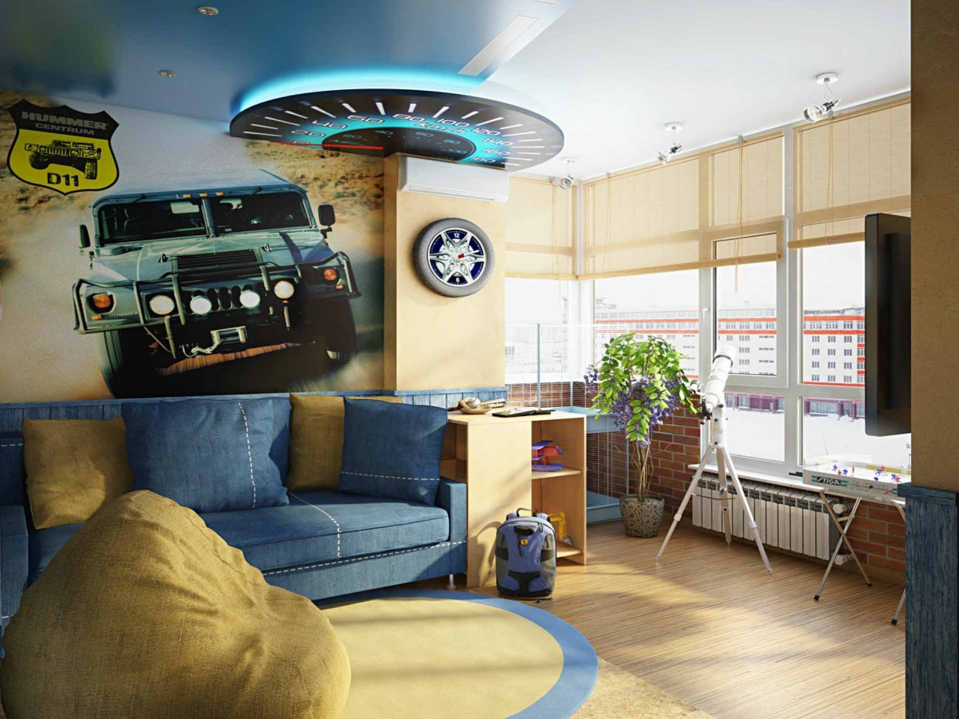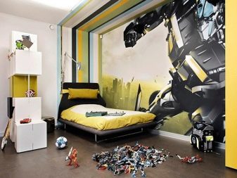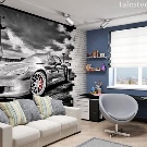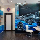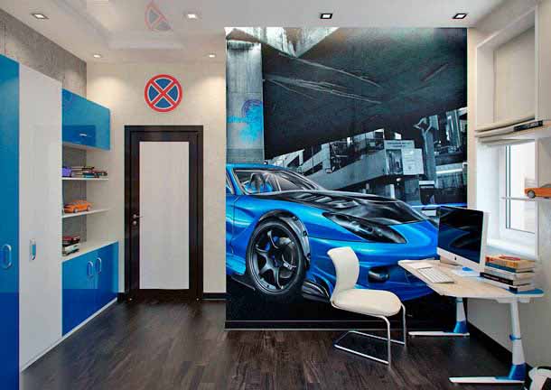 Little boys love small cars, for example, racing cars from the popular cartoon "Cars". In adolescents, such love can turn into a passion for modern race cars. So why not decorate the wall in the bedroom of a teenager with a large image of a supercar? In addition to such photo wallpapers, you can additionally put in modern fancy furniture, for example, bean bags, suitable curtains and compact lighting fixtures.