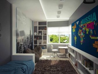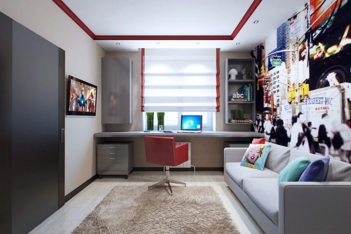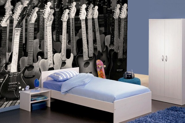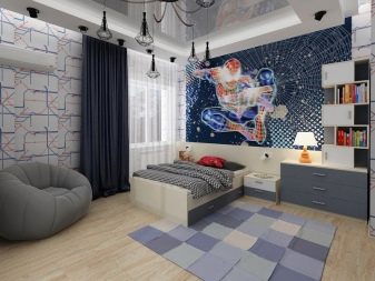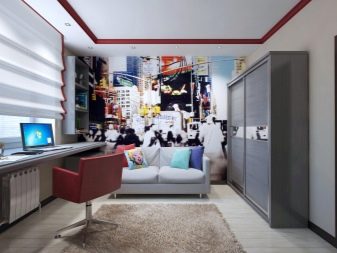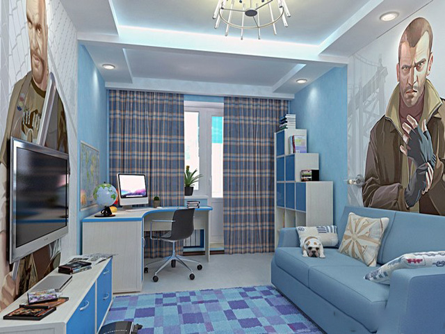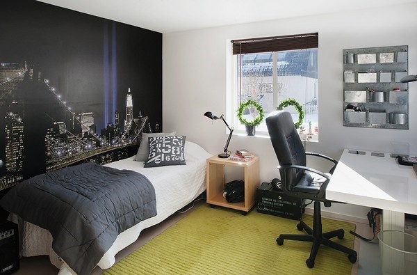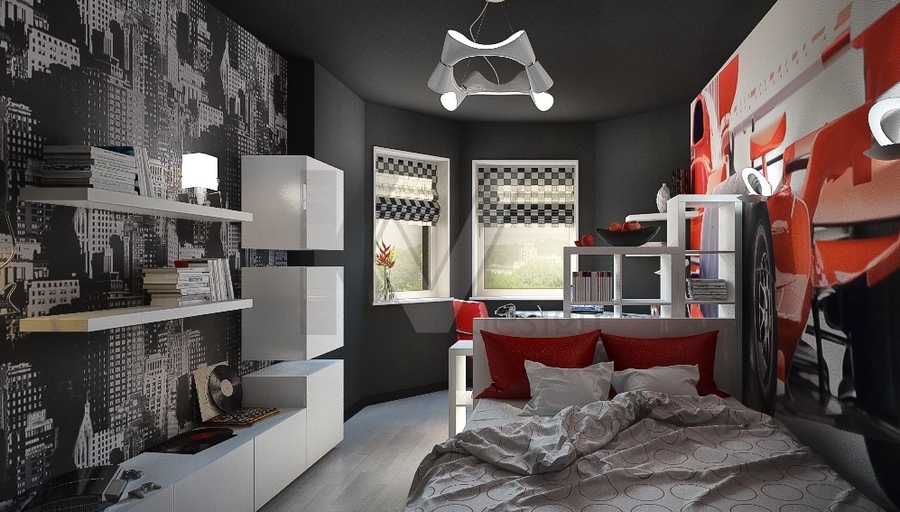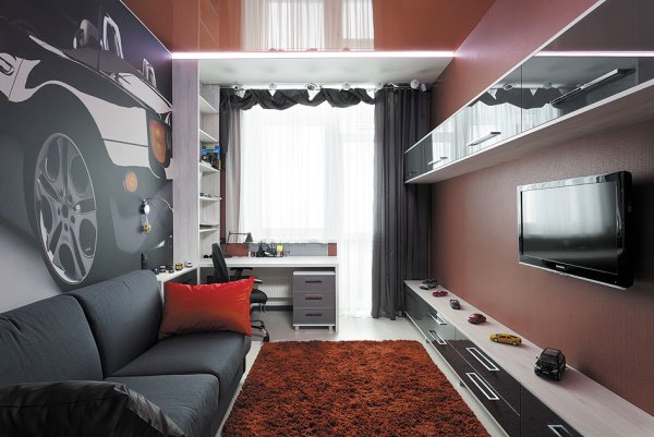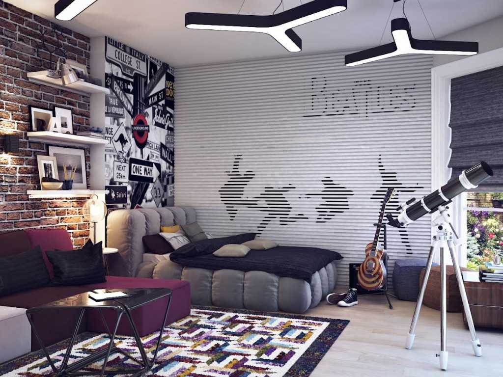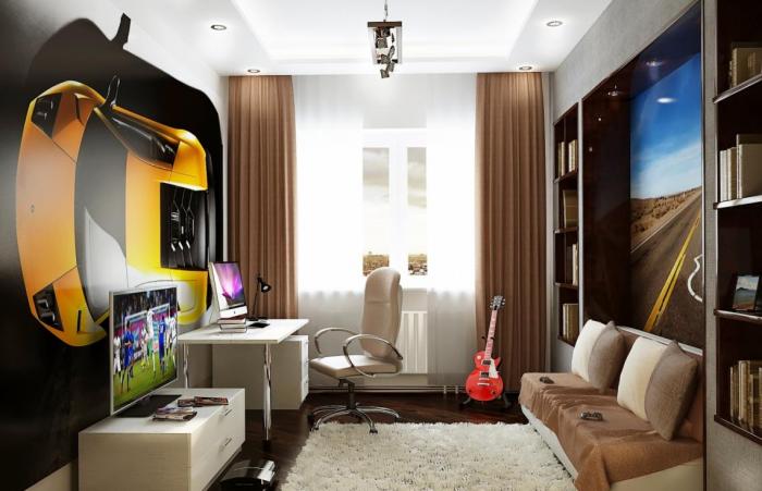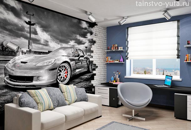 The interior of a room for a teenager should show others his individuality, taste preferences, and the simplest way of self-expression is just a photo wallpaper. They can depict favorite comics, transportation, sports equipment, portraits of favorite musicians, actors, abstract drawings, etc. One should not lose sight of the moment that the room where the teenager lives should be liked by his friends, since the opinion of peers is extremely important for the younger generation. Therefore, it is better to entrust the choice of wallpaper on the wall to the young man himself, since only he knows that he will definitely like it and will be enjoyed by his friends.