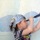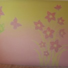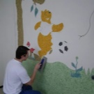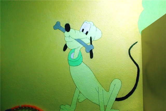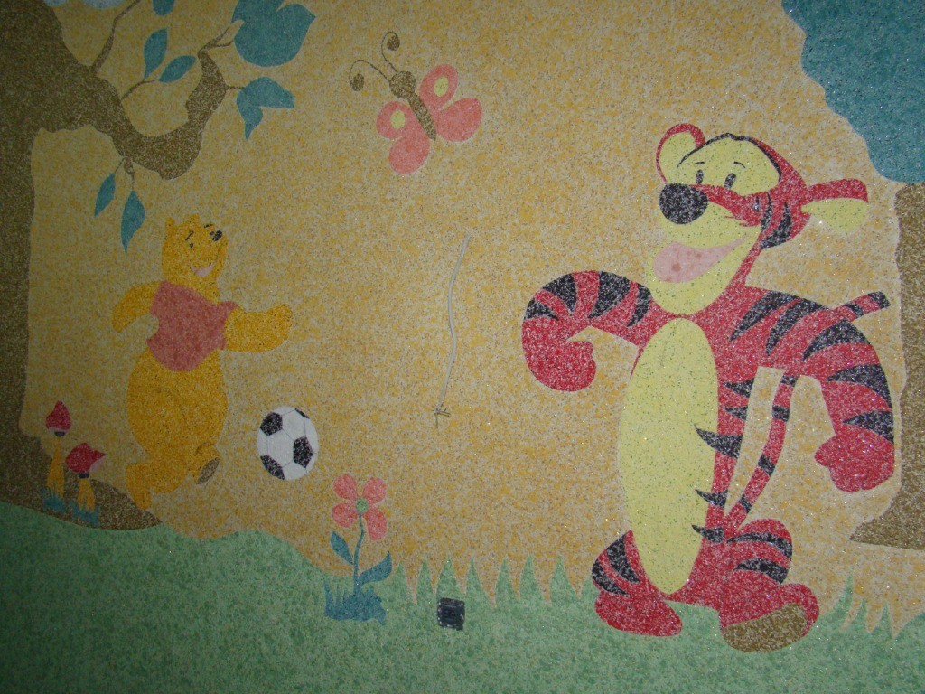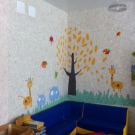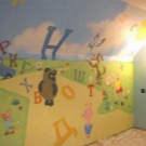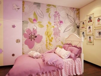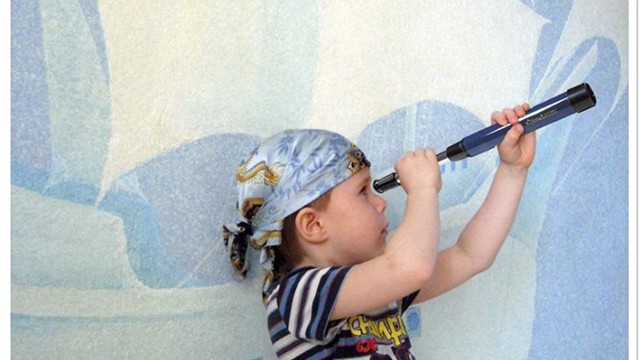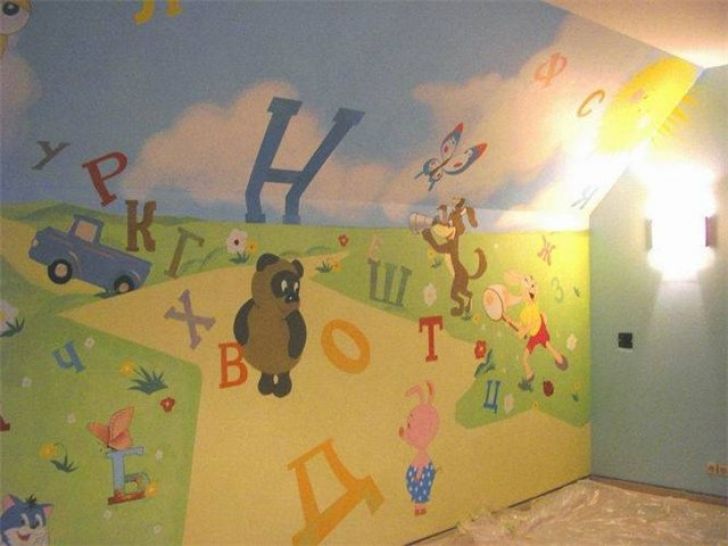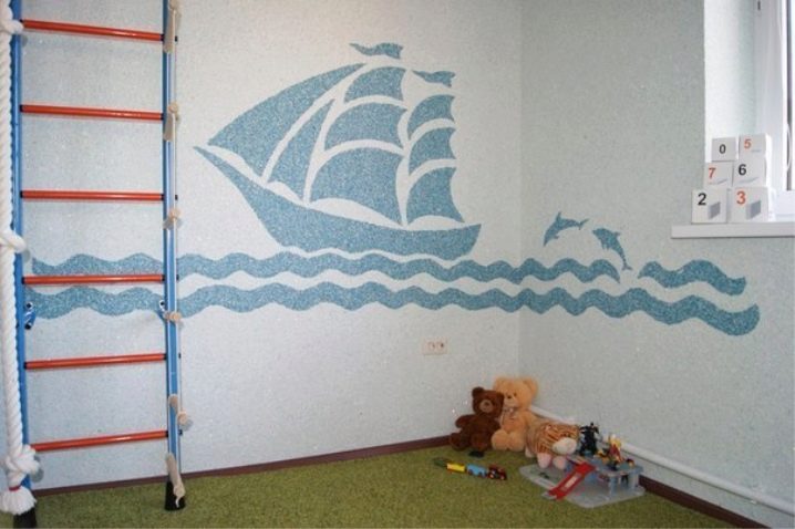 For preschoolers 3 - 6 years old, you can use brighter paints of liquid wallpaper and drawings on the wall, which can broaden your horizons, prepare for school. A good option would be the image of the alphabet, numbers, animal species or plants. Also very popular are the images of favorite characters from cartoons, toys, dolls, fabulous landscapes, castles, wizards. For girls, pink tones would be preferable, for example, the image of a bear on a flower meadow, which harmoniously fits into the interior of the room. The boys will love the blue sailboat with waves and dolphins on a white background.