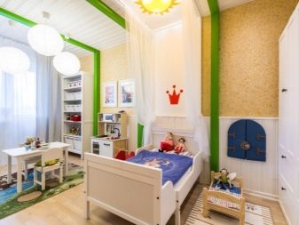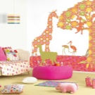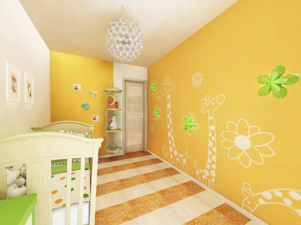 If you intend to use the room for a child up to 3 years, then you need to give preference to pastel dim tones that will not cause too much anxiety and will not disturb sleep. For example, images of giraffes and voluminous green petals on a gentle yellow background are perfect in the interior.