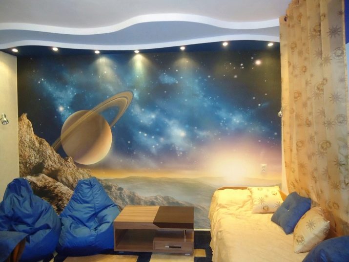 Very impressive is the combination of liquid wallpaper with wallpaper, curly-shaped ceilings and side lighting. For example, an amazing alien landscape with a starry sky.