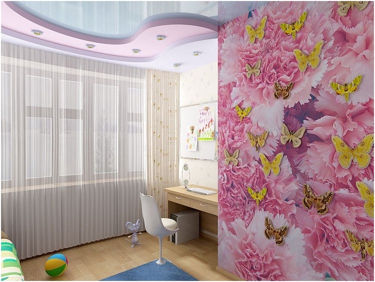 Given that we are talking about finishing the ceiling for a girl's room, then if you choose pink as an additional color, you won’t regret it. It also looks nice pale purple shades or light blue.