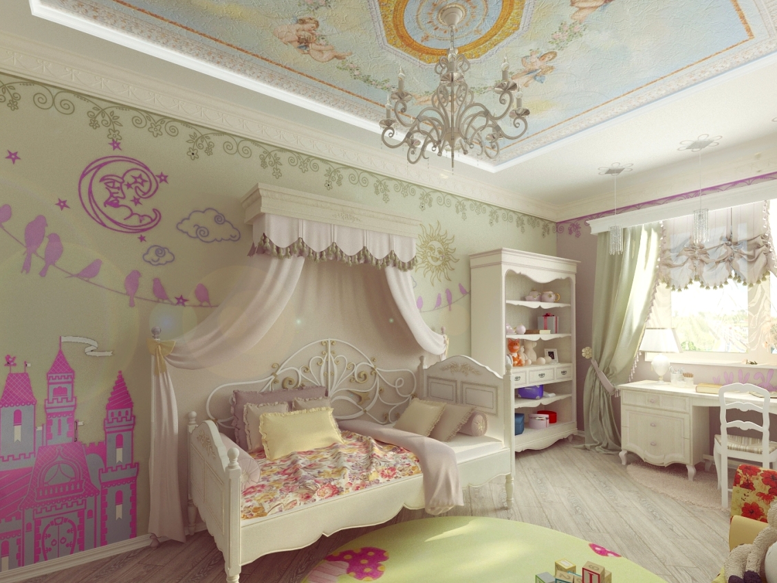 Paint or wallpaper. Surely you have seen the interiors, where the whole room - the walls, the ceiling and even the floor are hung with "clouds". Of course, this option is more like madness, but there are some advantages in the wallpaper on the ceiling. The first - it does not hit hard on the family budget. Secondly, you can do it yourself, without the help of specialists and, moreover, relatively quickly. A very good option may look to combine drywall and wallpaper. You can make your year a dome or a window into the underwater world, space, jungle, fairy kingdom - your daughter will appreciate it.