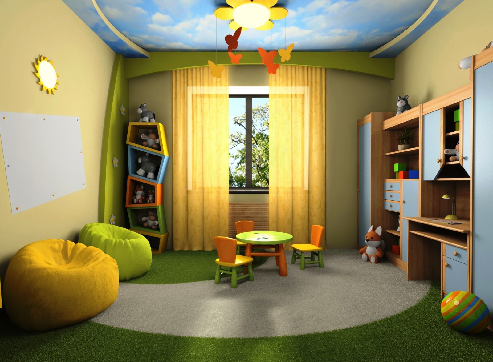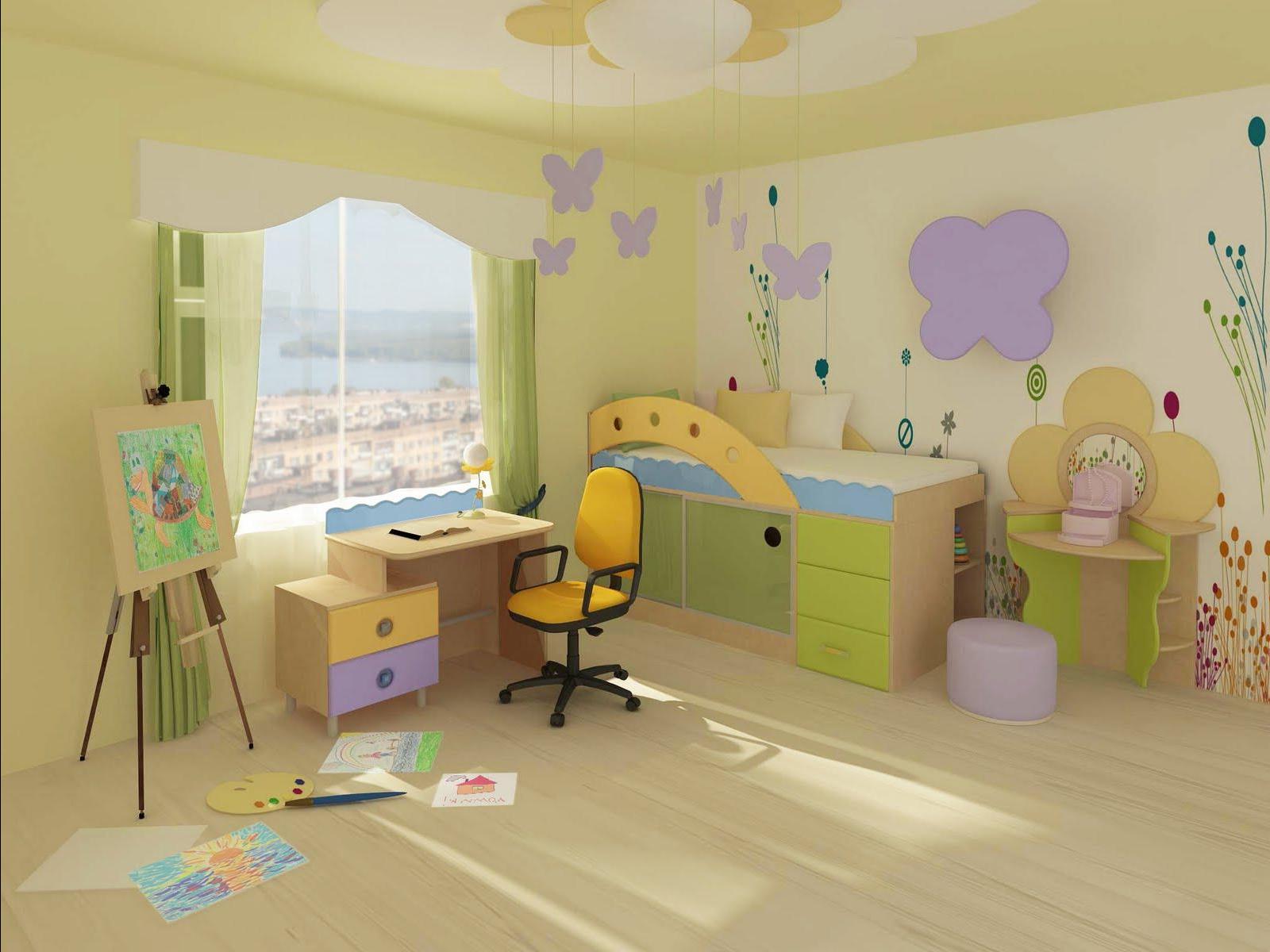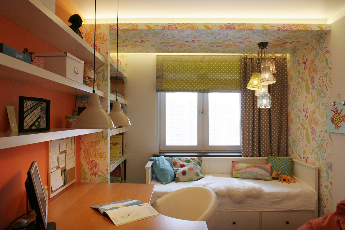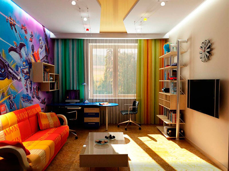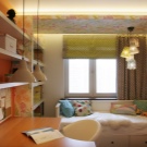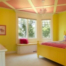 The yellow color causes mental activity in the child, so it is better to place the ceiling of this color above the working area, where the child will learn the lessons. This will help him concentrate.