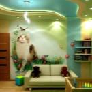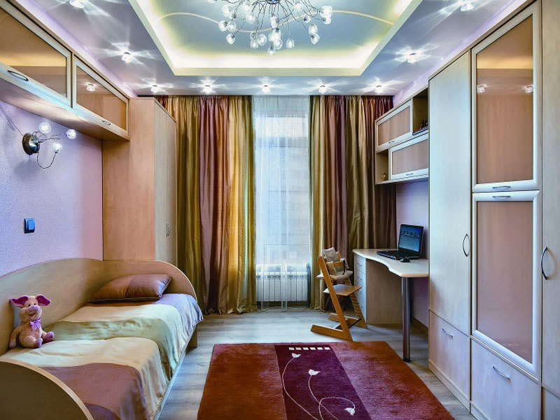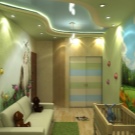 The ceiling is made of two levels and more perfectly helps to delimit the space of the nursery, to provide a place to sleep, a play area, a desktop. They will also be useful in a room where children of different sexes live. He will help arrange the children's room in accordance with the desires of both children.