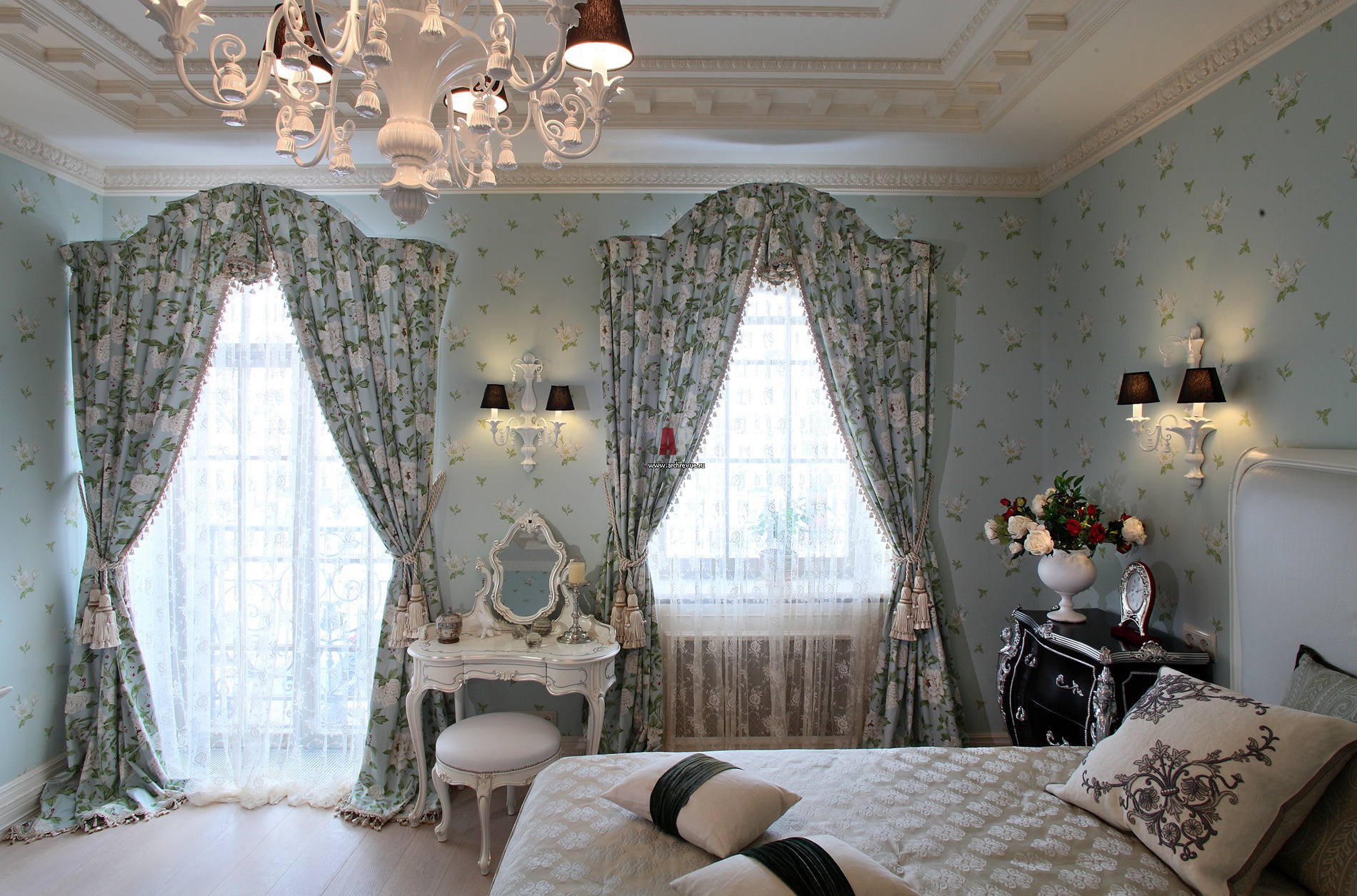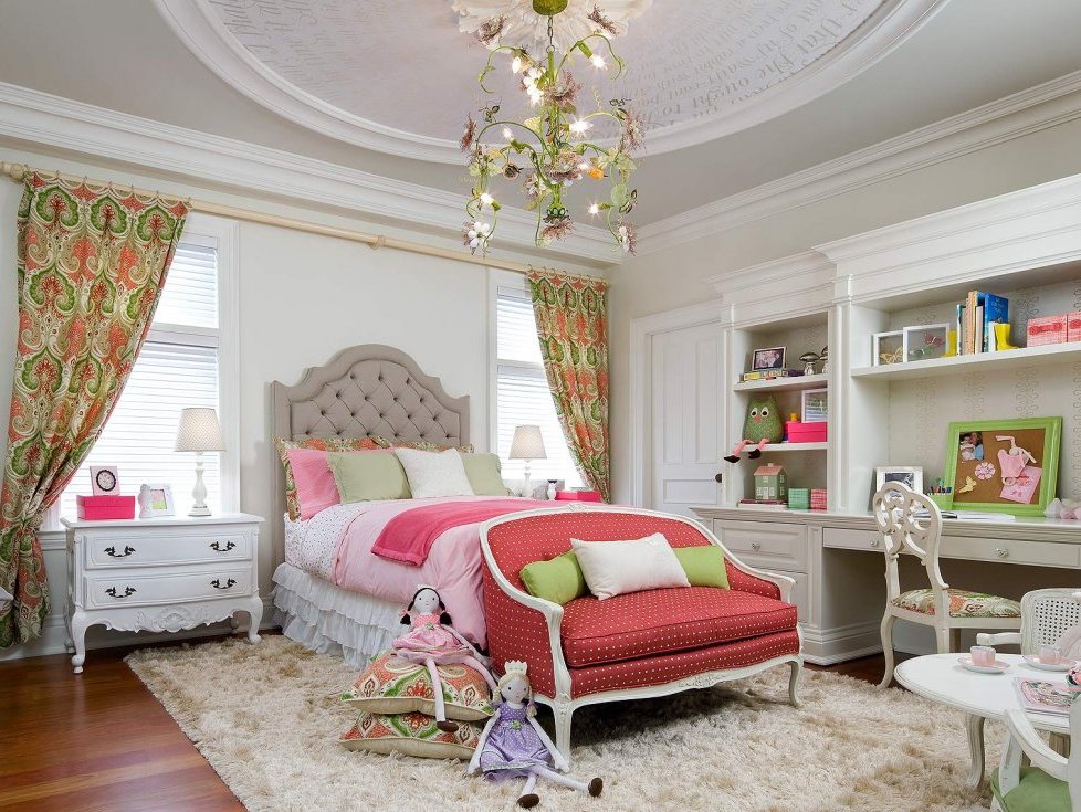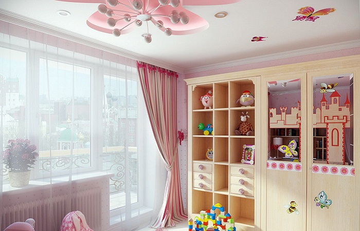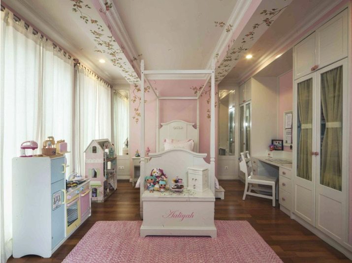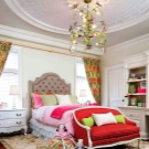 The ceiling of plaster (not to be confused with drywall) has been used in the finishing of apartments for a very long time. It can be made of slabs, and you can create unique patterns of stucco. In the nursery allowed the use of such a ceiling. With the help of stucco pattern on the ceiling, you can finish the design in the room of the princess.Such parts can be mounted not only directly on the ceiling, but also on the suspended, and even on the tension, just warn the masters who install the suspended ceiling on the use of gypsum elements.