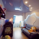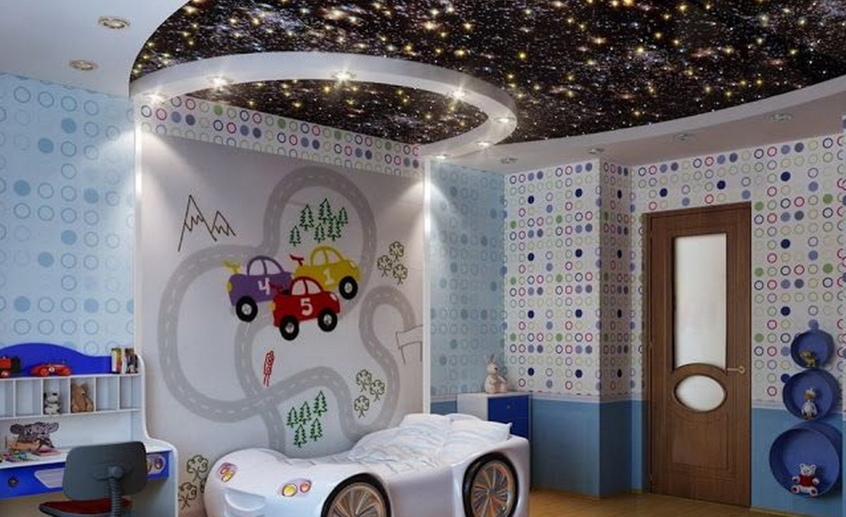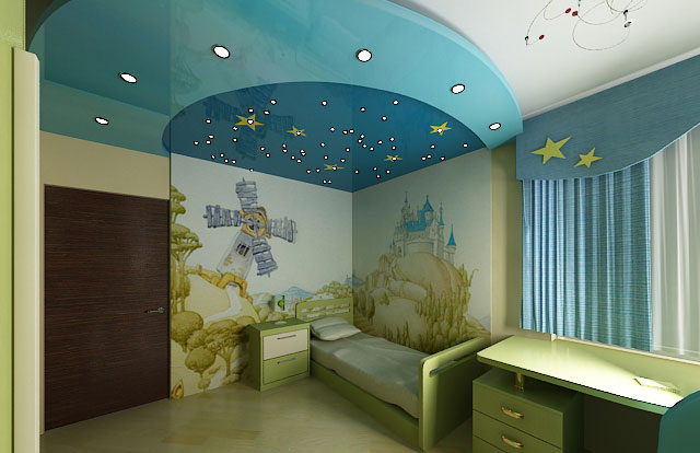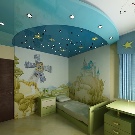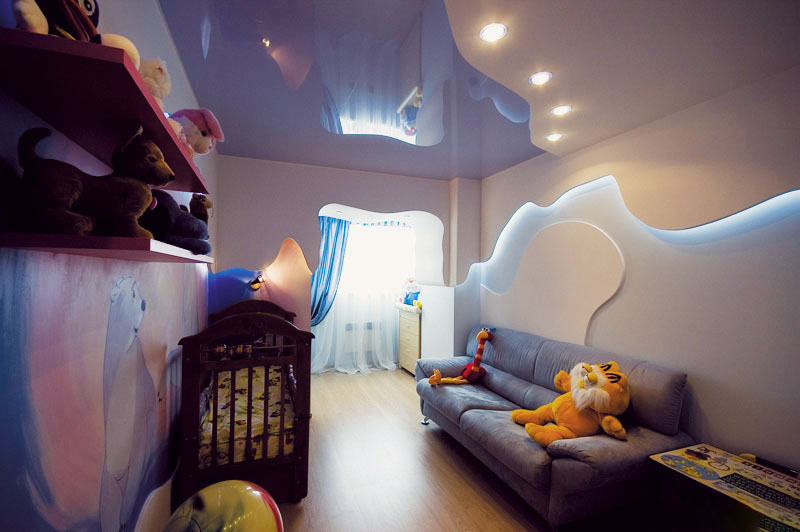Stretch ceilings can pick up any color from plain to ceiling with a variety of patterns, including cartoon characters. This ceiling will allow you to create the illusion of a starry sky if you hide the LEDs under it, and also help to embody practically any design idea.