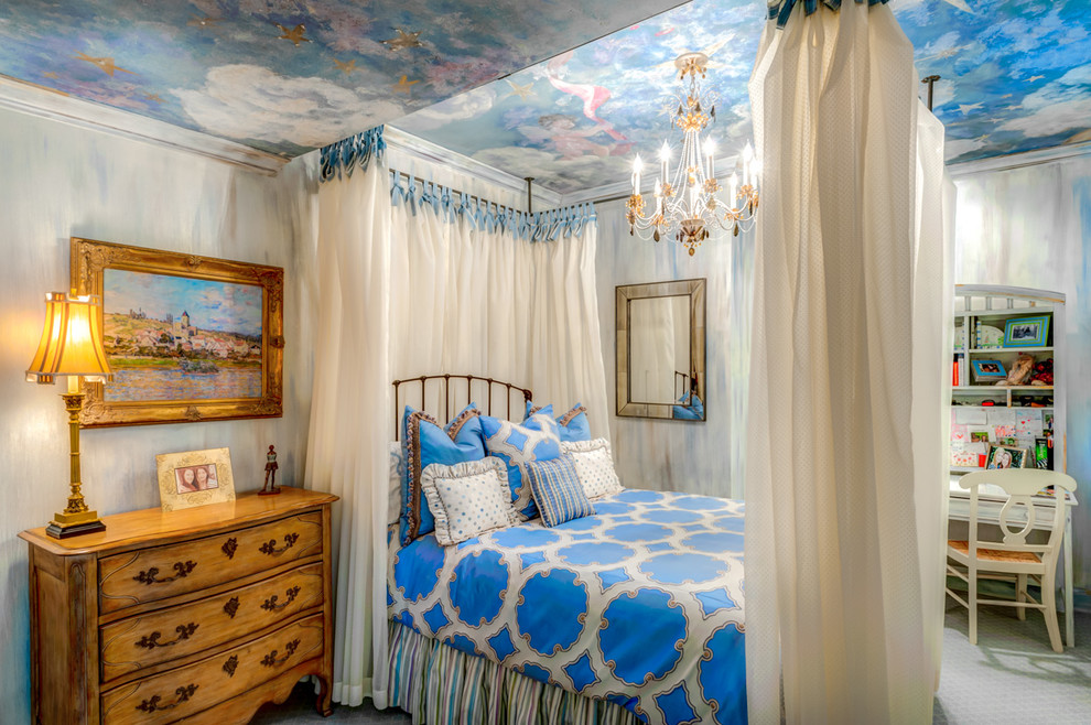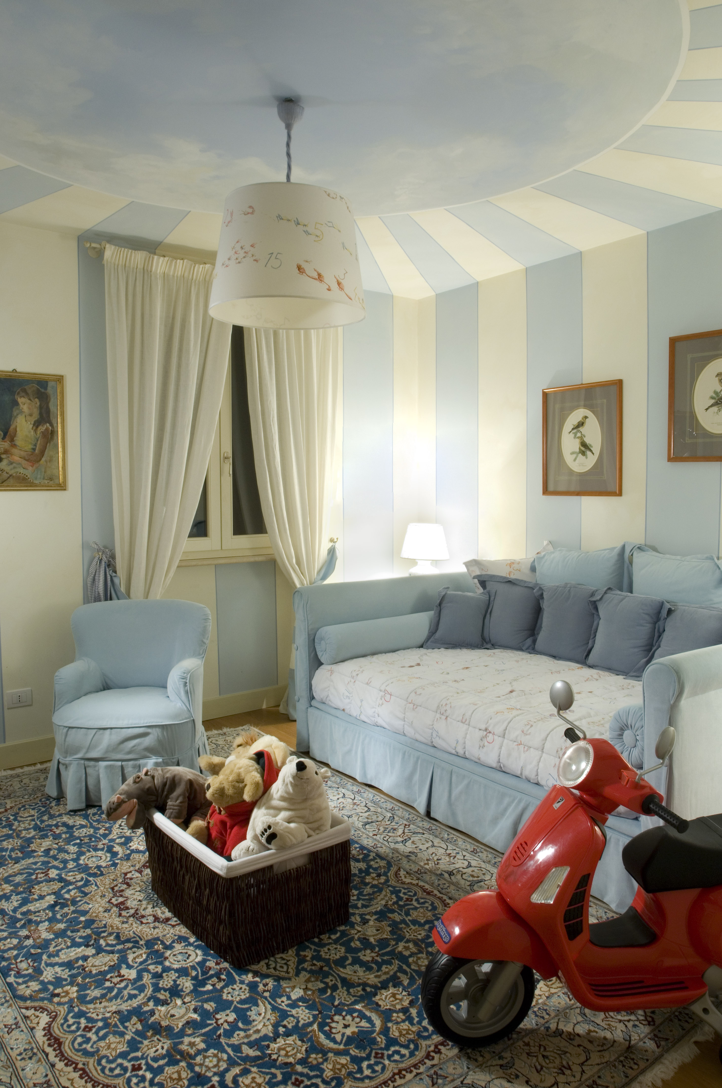Blue sky with running clouds over the bed, suitable for both the baby and the teen girl. Performed by painting the ceiling in the nursery.