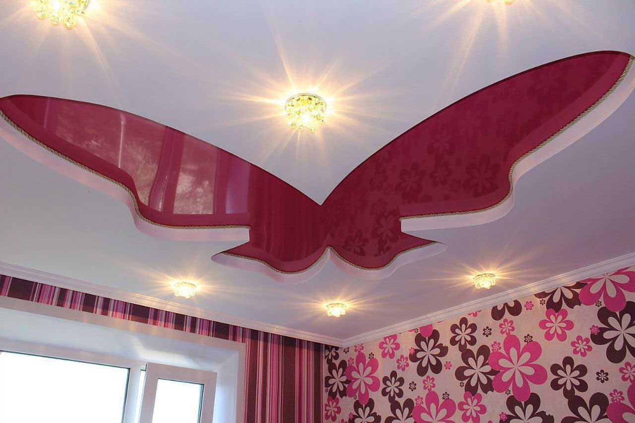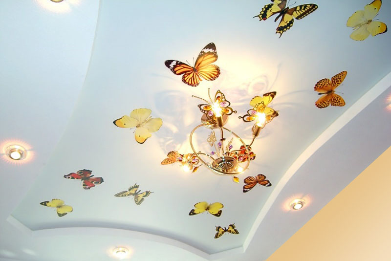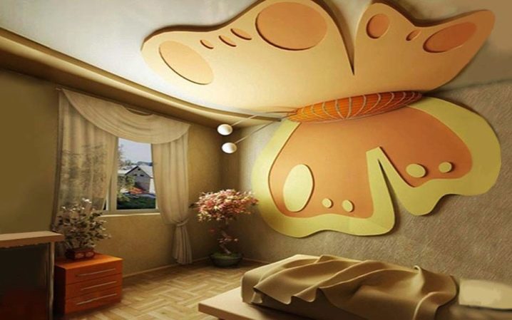 In addition, such a ceiling provides virtually unlimited design ideas. Here you can embody the most daring idea. Ideas of the cosmic sky with stars are very popular. This ceiling will soothe the nervous system of the child before bedtime. In addition, figured tiers near the ceiling can also be made of drywall. For girls, you can arrange it in the form of butterflies, and for boys in the form of an airplane.