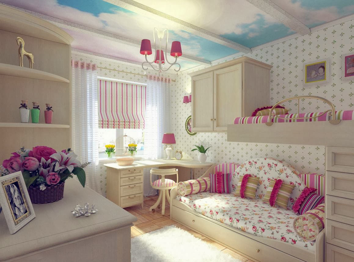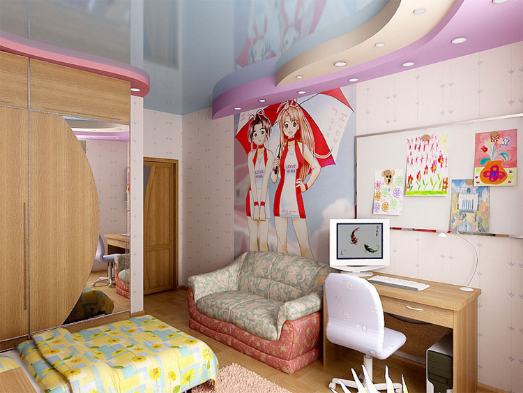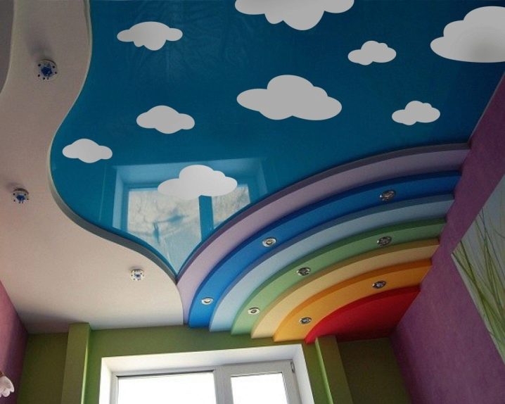 For older children, it is preferable to choose monochromatic ceilings, but you can also play with color.