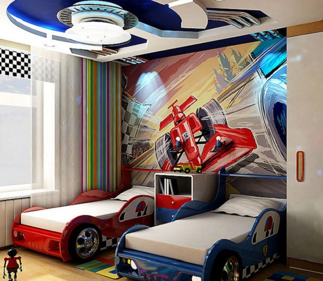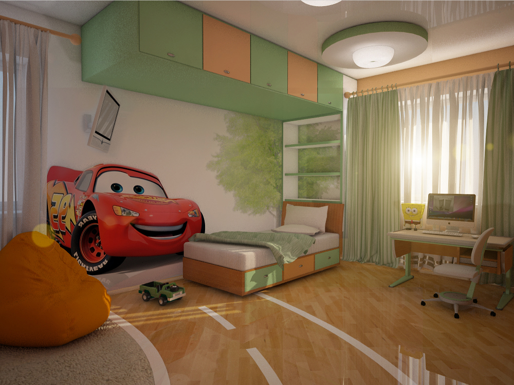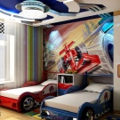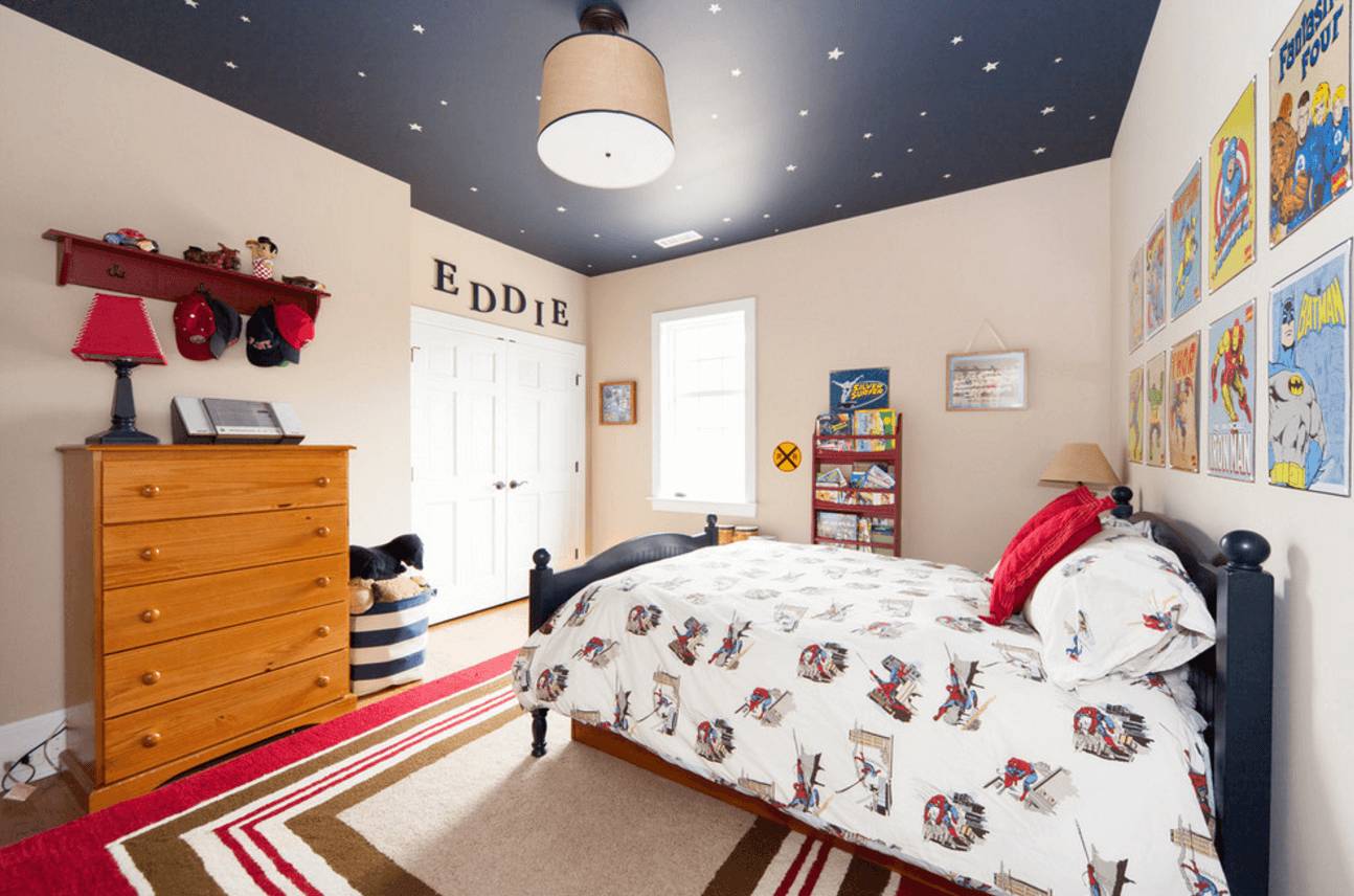 For a boy aged 5 years, bright colors, interesting prints will do. And for older people, on the contrary, a more restrained tonality: brown, beige, green, light blue, etc. The subject with superheroes remains topical. For kids, you can portray on the ceiling of your favorite robokara Polly, Pig Peppa, Lightning McQueen. Older boys - photo portraits with Superman, Spiderman, Wolverine, etc.