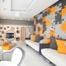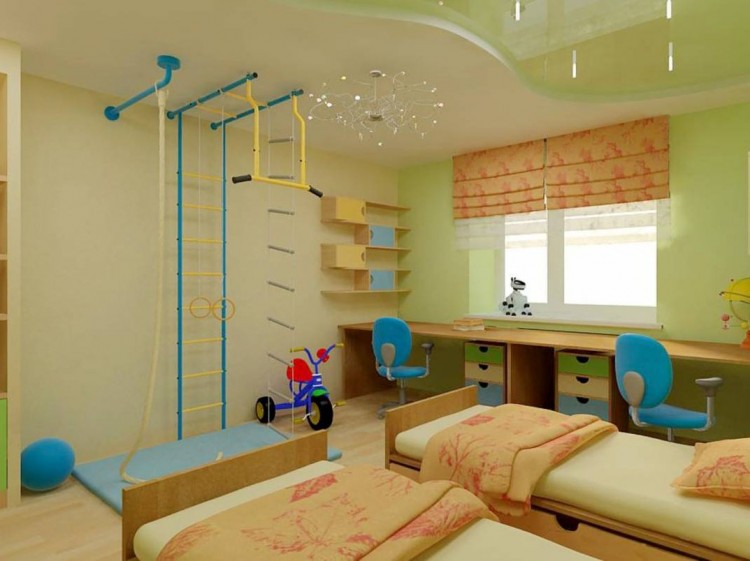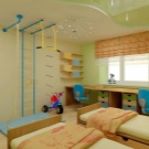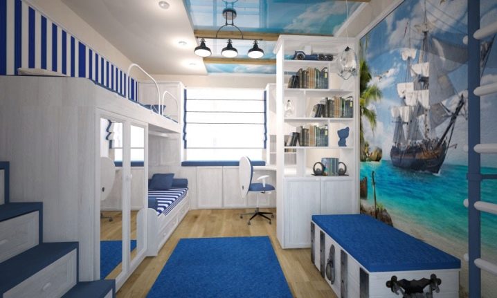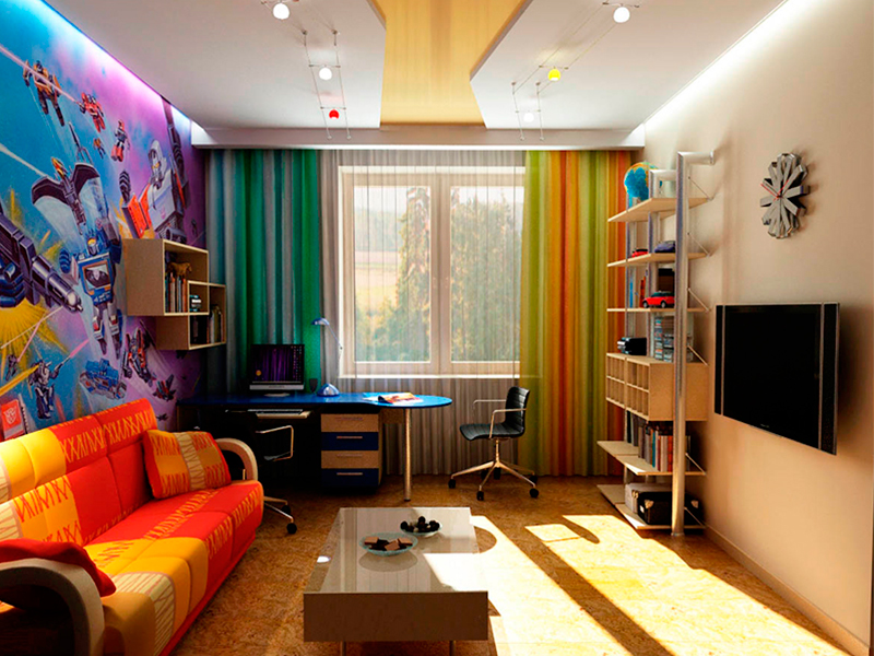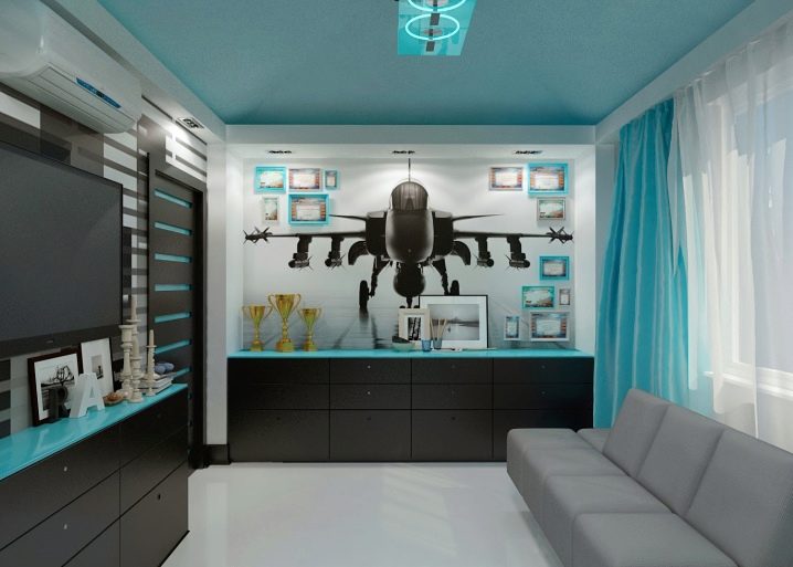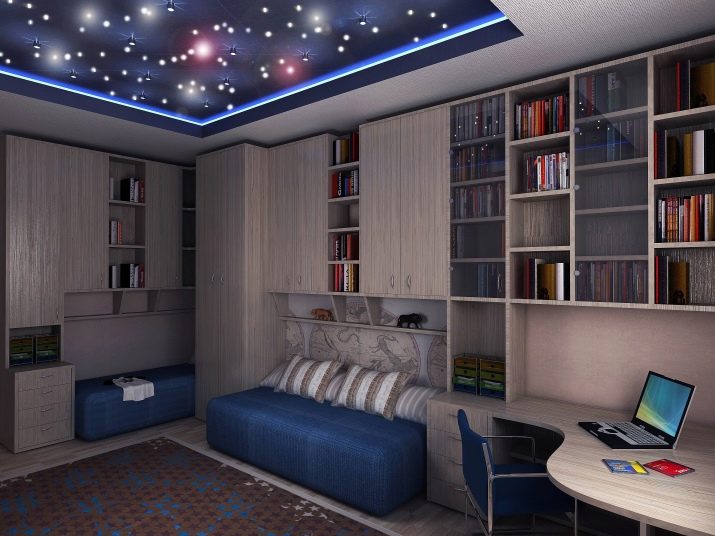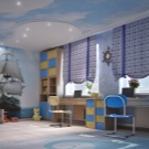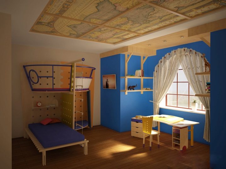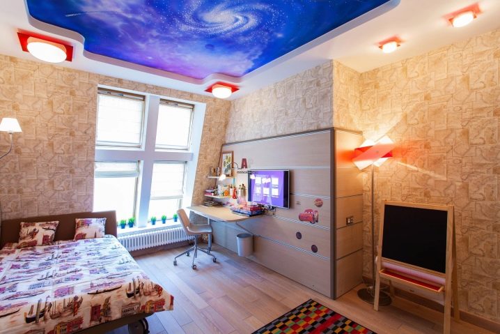 Multi-level ceiling will help to zone the space, to allocate a separate working, playing area, a sleeping place. Experts recommend to make the lower level of plasterboard, which can be changed at any time, without moving furniture away. Please your rising generation, invite your son to settle in the real kingdom, “fly” beyond the limits of space or find yourself in Narnia, Neverland, to become the hero of your favorite movie, book.