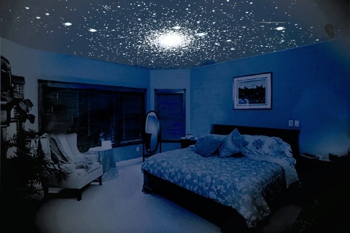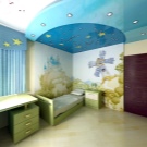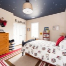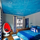 The most harmonious looks saturated blue color, shade riverside, indigo or electrician. Combine this color palette with snow-white walls. Light brown, beige, sandy, gray or yellow will also act as a contrasting tone. The more drawings presented on the ceiling, the more restrained the walls should be. Only one of them can be made out with the help of thematic vinyl stickers on the theme of Cosmos.
