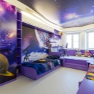 Modern designers of children's rooms constantly invent new plots for ceilings. You can invite a professional artist, create a charming photo collage from family photos, or use a couple of fresh ideas. Little dreamers will be crazy about space subjects over their heads. Decorate such a room with several decorative objects (lamps with a projection of the starry sky, neon stickers in the form of the moon and planets). Against the backdrop of the ceiling dotted with the Milky Way, comets and other space bodies, all this will look really impressive.
