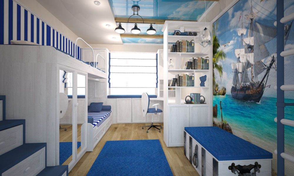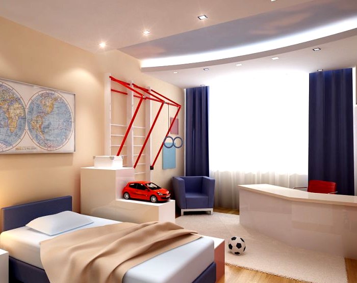 For a boy, there is nothing better than to spend his childhood imagining himself a pirate, a space ranger, a superhero. Choose the right lighting for his room, safely mounted in the ceiling. The light should fall in such a way as to perfectly emphasize the advantages of the chosen color range of the structure, without obscuring important areas of the picture.