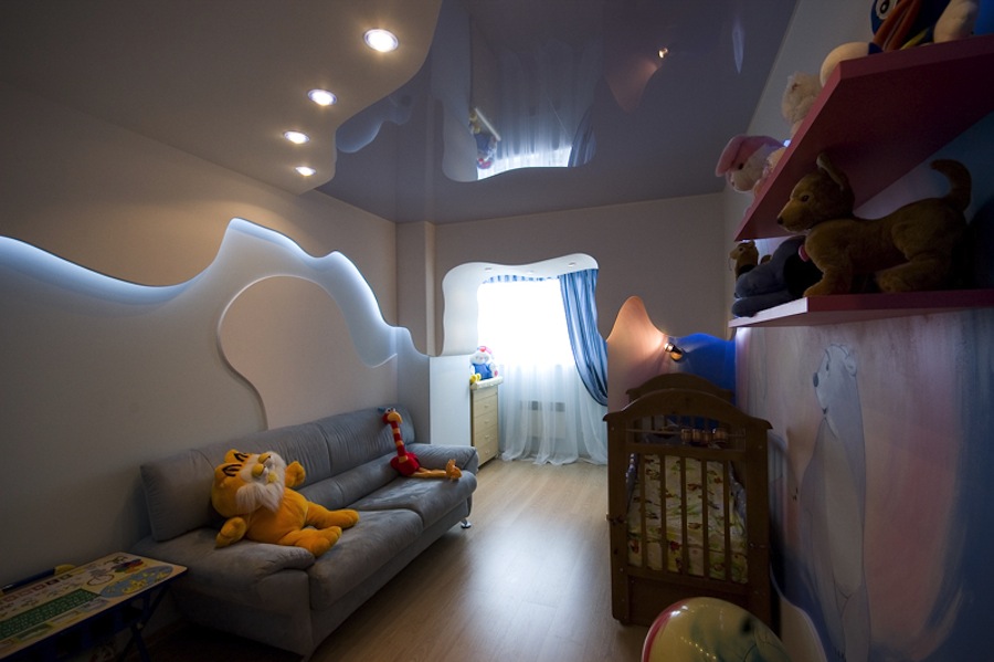 By installing a similar system, you will encounter a minimum of dirt and debris. As a result, you will get an absolutely smooth, smooth surface on which you can easily apply a textured vinyl image or a volume photo print.In the nursery with a stretch ceiling, you can embed any size lamps, arrange high-quality sound insulation. Inside the rocket, a fabulous house in the forest, your baby will not be threatened by anything!