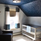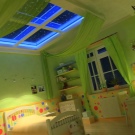 This type of stretch ceiling is the most expensive, but its lighting system can be adjusted both manually and remotely. Skillfully applied to the pearlescent surface, the picture very realistically represents on the stretch ceiling of the nursery the invitingly flickering known and unknown constellations that capture the imagination of galactic clusters and the infinitely mysterious milky way.