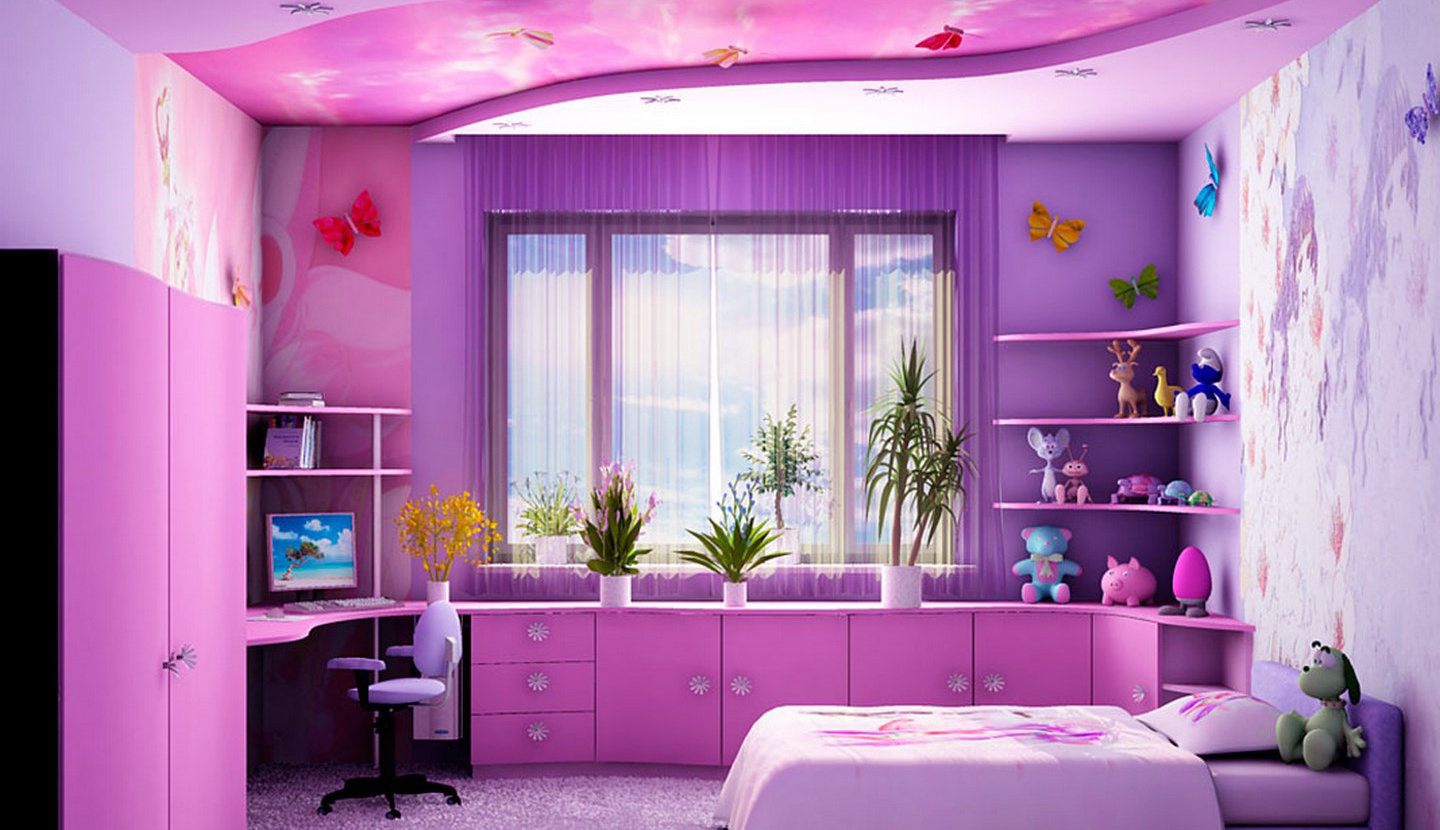 But girls often require a special approach to changes in personal space, and therefore they are more selective in the design of the stretch ceiling of their room. Young ladies are vividly involved in the choice of style, and in the design of the frame design, and in determining the colors of all the details of the future design. That is why stretch ceilings in rooms for girls are characterized by high complexity and great variety. As well as a careful selection of shades of the image, which will decorate a stretch ceiling in the room of the little hostess.