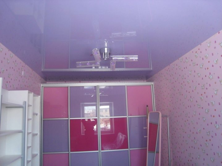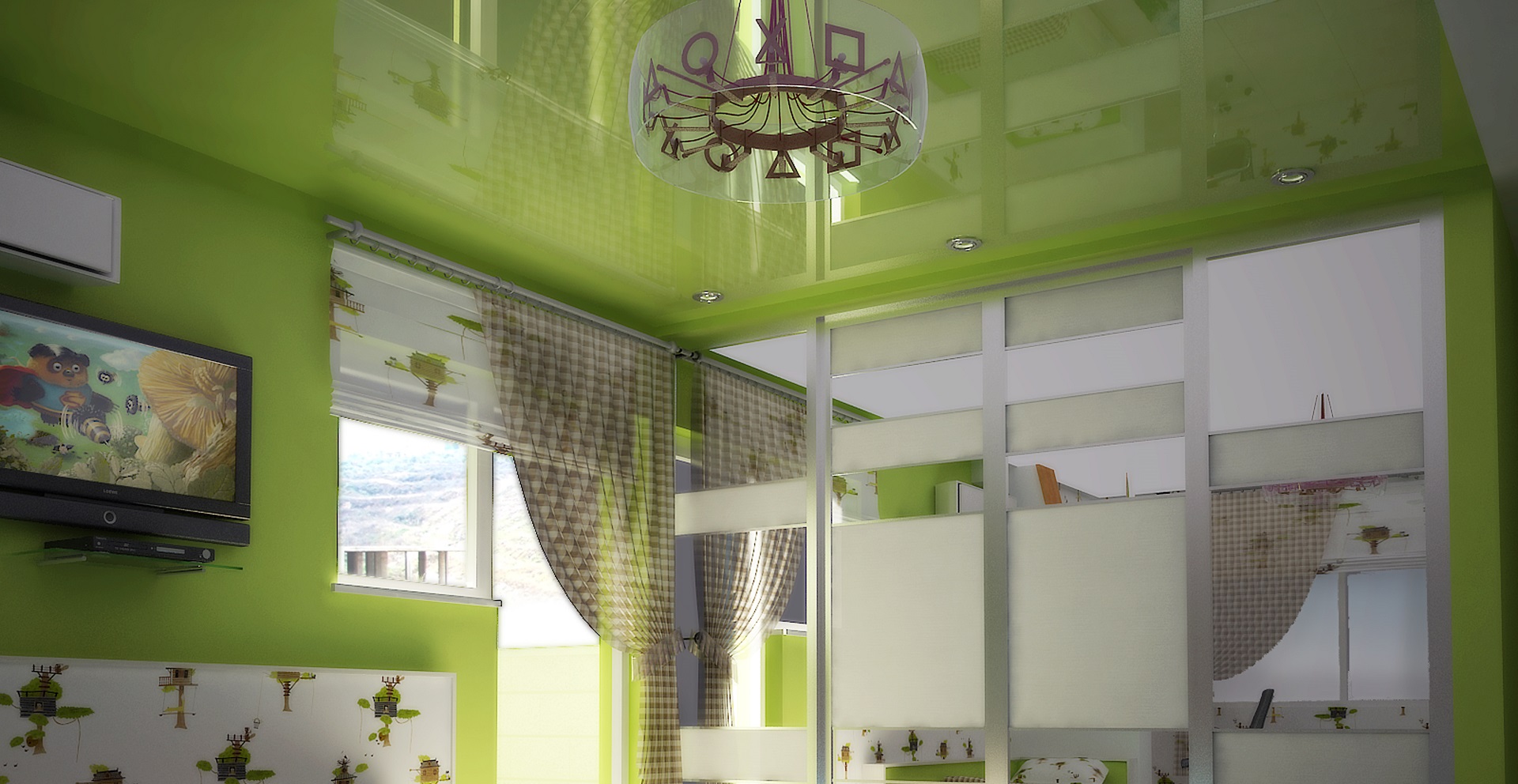 Glossy - universal assistants in the arrangement of "mirror", spacious and non-standard interiors filled with light, color and creativity. High-quality glossy ceilings for children's rooms are made from hypoallergenic and anti-static materials, just take care of them and easily hide electrical wiring and ventilation equipment. The glossy coating of the suspended ceiling will come to the rescue in a small and poorly lit nursery - with proper planning, the space of the room can be visually almost doubled.