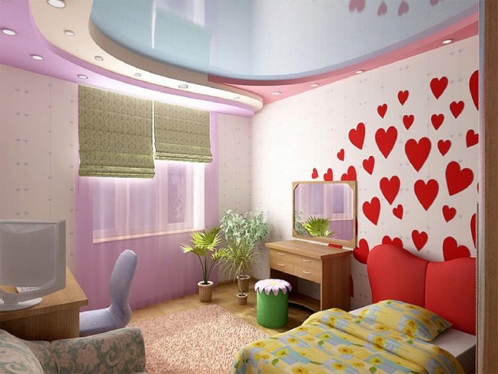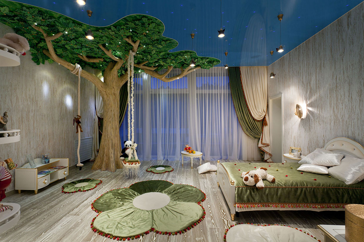 Stretch ceilings are beautiful, aesthetic, durable (manufacturers give guarantees for a period of 15 to 50 years), absorb noise well, do not require special repairs and are able to fit into the most exotic interior design solution.Advanced developments in the manufacture of stretch ceilings for children's rooms allow us to give them high strength, flexibility and any texture, as well as provide an opportunity to paint in various colors and apply various images to the surface.