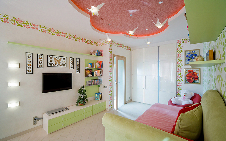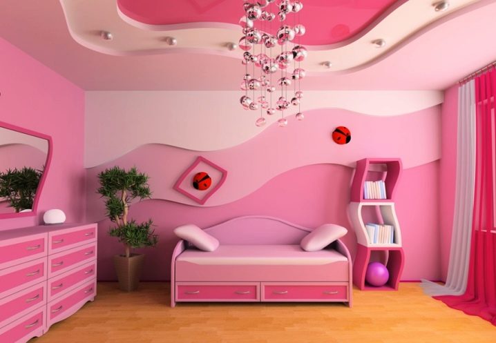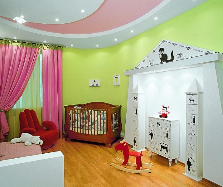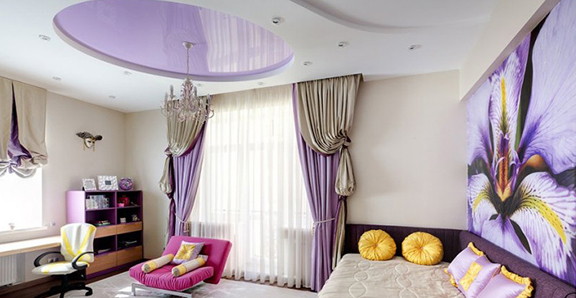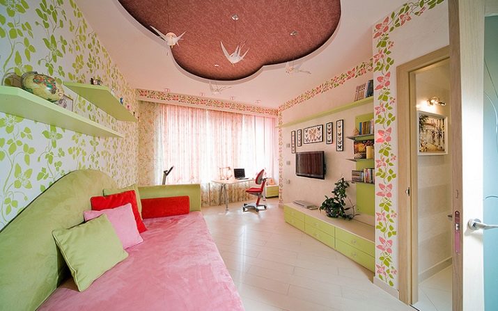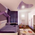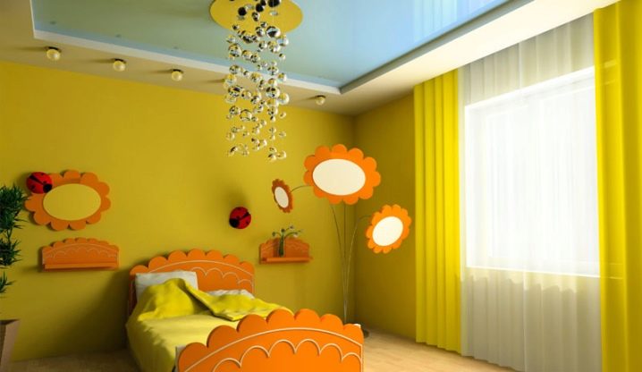 This type of ceiling has its advantages and disadvantages. This type of ceilings is loved first of all for the fact that they allow you to hide all the visual flaws of the base, without spending time and money on its alignment. They are hypoallergenic and perfectly absorb moisture. Therefore, any child will feel extremely well in such conditions.