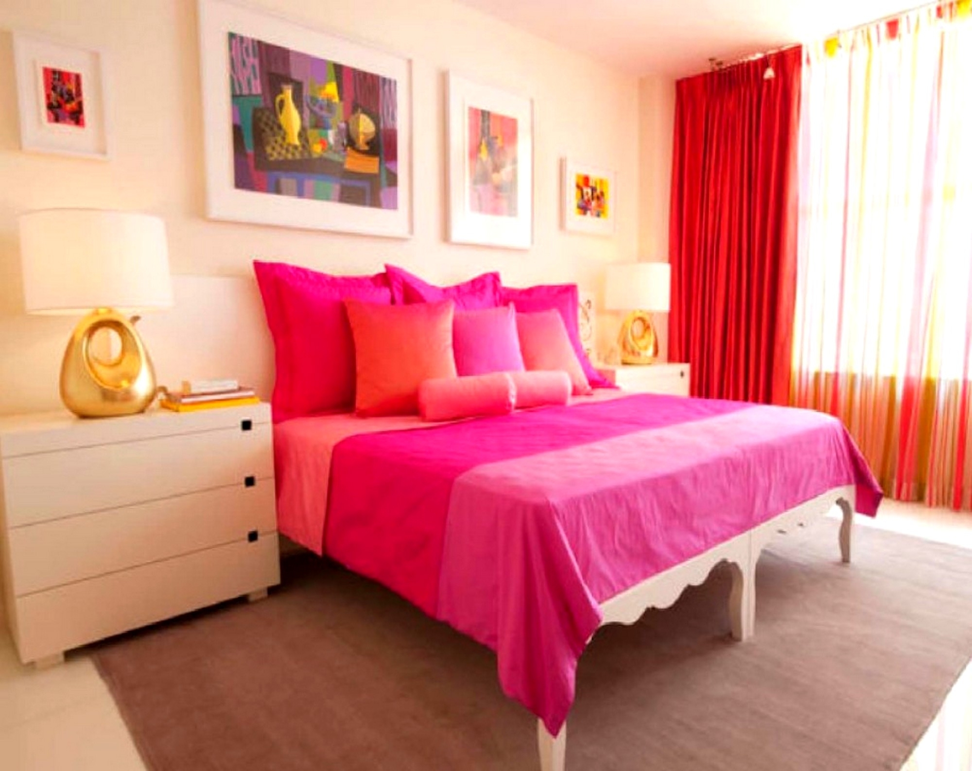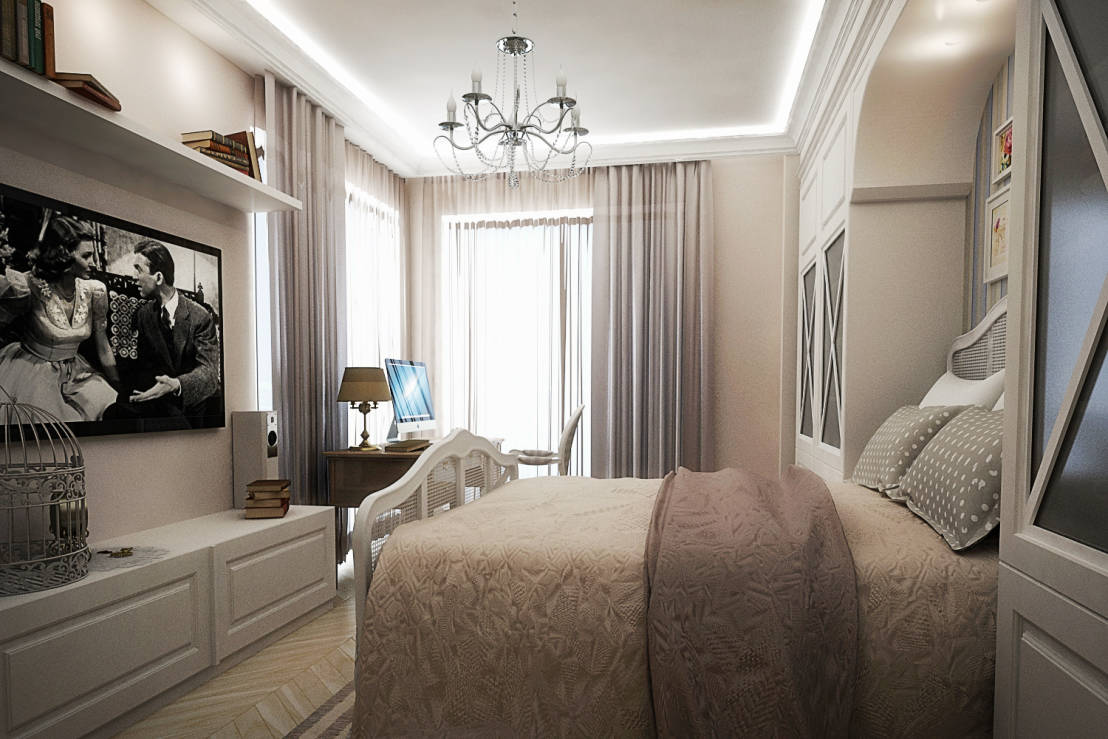 - An original solution would be the combination of thick curtains with the material and the tone of furniture upholstery, for example, with a bedspread for the bed in the bedroom.