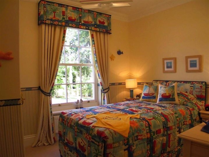 Lambrequins in the room for children are characterized by bright colors,funny drawings and competent combination of every detail. The model is selected based on the overall design in which the room is decorated. The themes here can be the most diverse: marine, automotive, fairytale, sports, fruit and berry, or one that best reflects the character and outlook of children.
