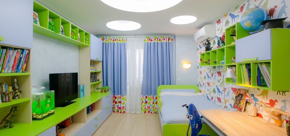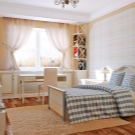 Curtains for the nursery in Khrushchev should be made of lightweight fabrics. For girls - with a floral pattern, for boys - with space or geographical. A universal option will be plain shades of light green or light pink color.